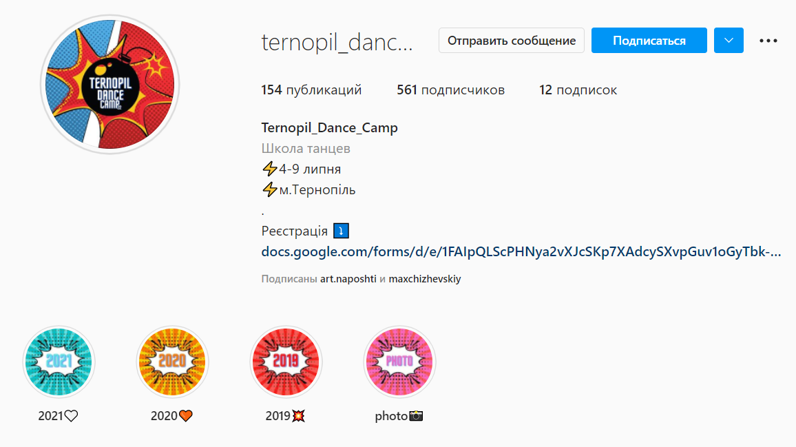 Інші деталі щодо реєстрації, програми табору, місця його проведення, інформацію про тренерів-танцівників можна дізнатись на офіційній сторінці в Інстаграмі, лінк на яку вказуємо: https://www.instagram.com/ternopil_dance_camp/