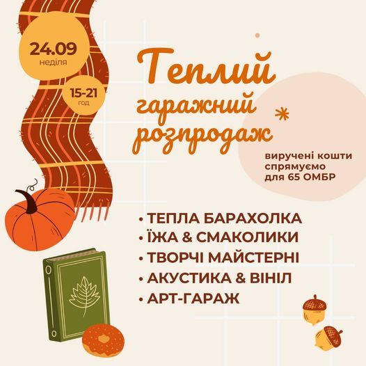 — Влаштуємо теплий гаражний розпродаж для душі, а всі виручені кошти (як і минулого року) спрямуємо на потребу 65 ОМБР, де служать чортків'яни. Бо ми це можемо робити тільки завдяки захисника, — кажуть організатори.