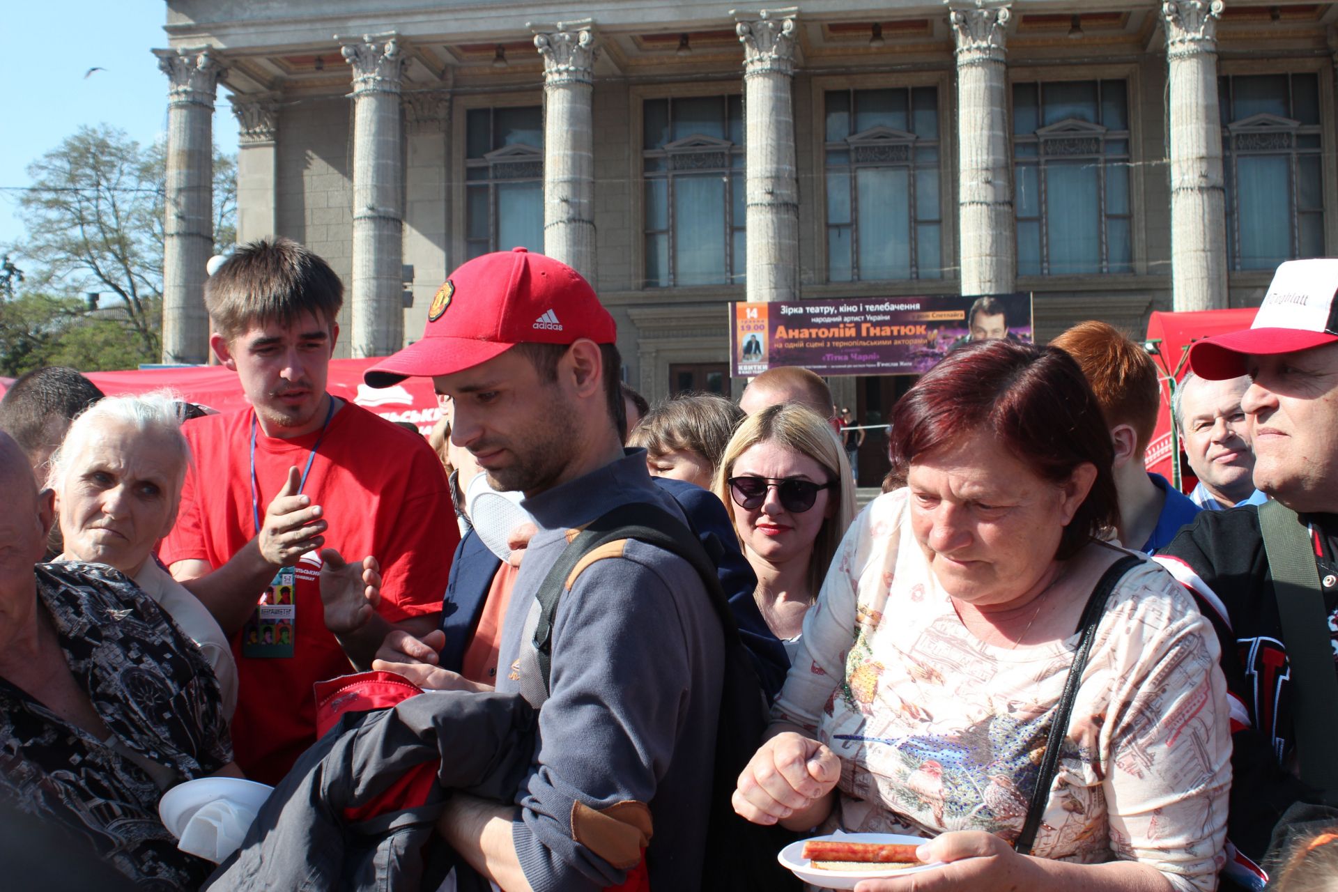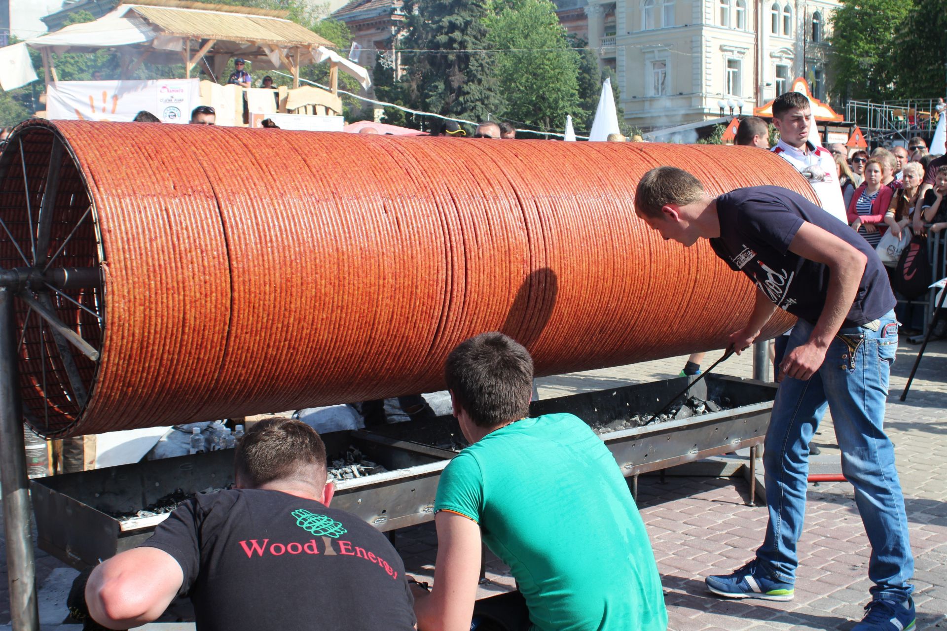 Величезні черги голодних тернополян вистроїлися задля можливості скуштувати рекордну ковбасу. "Дайте мені". "А мені 2, якщо можна". "І я хочу спробувати". Такі вигуки було чутно звідусіль.