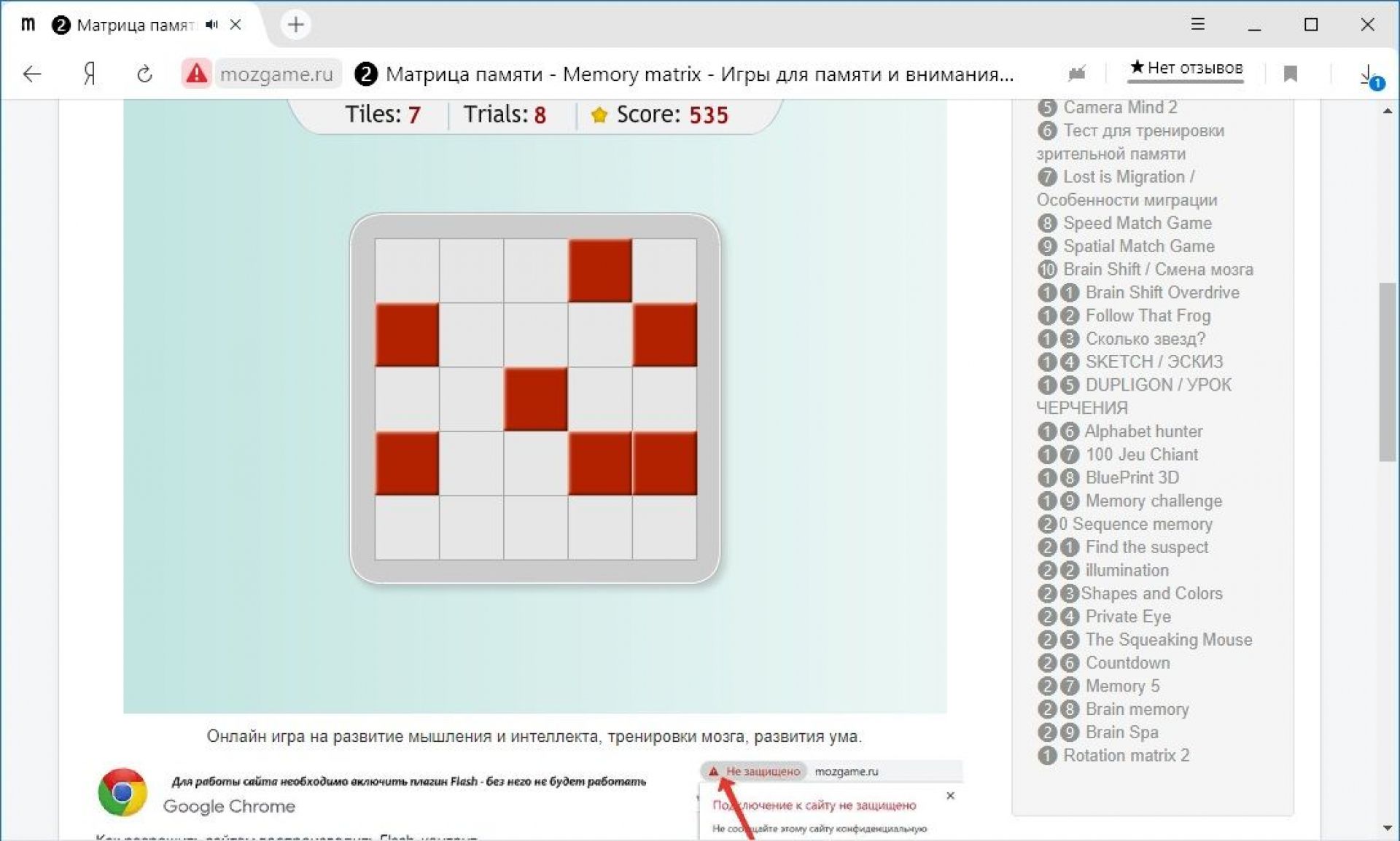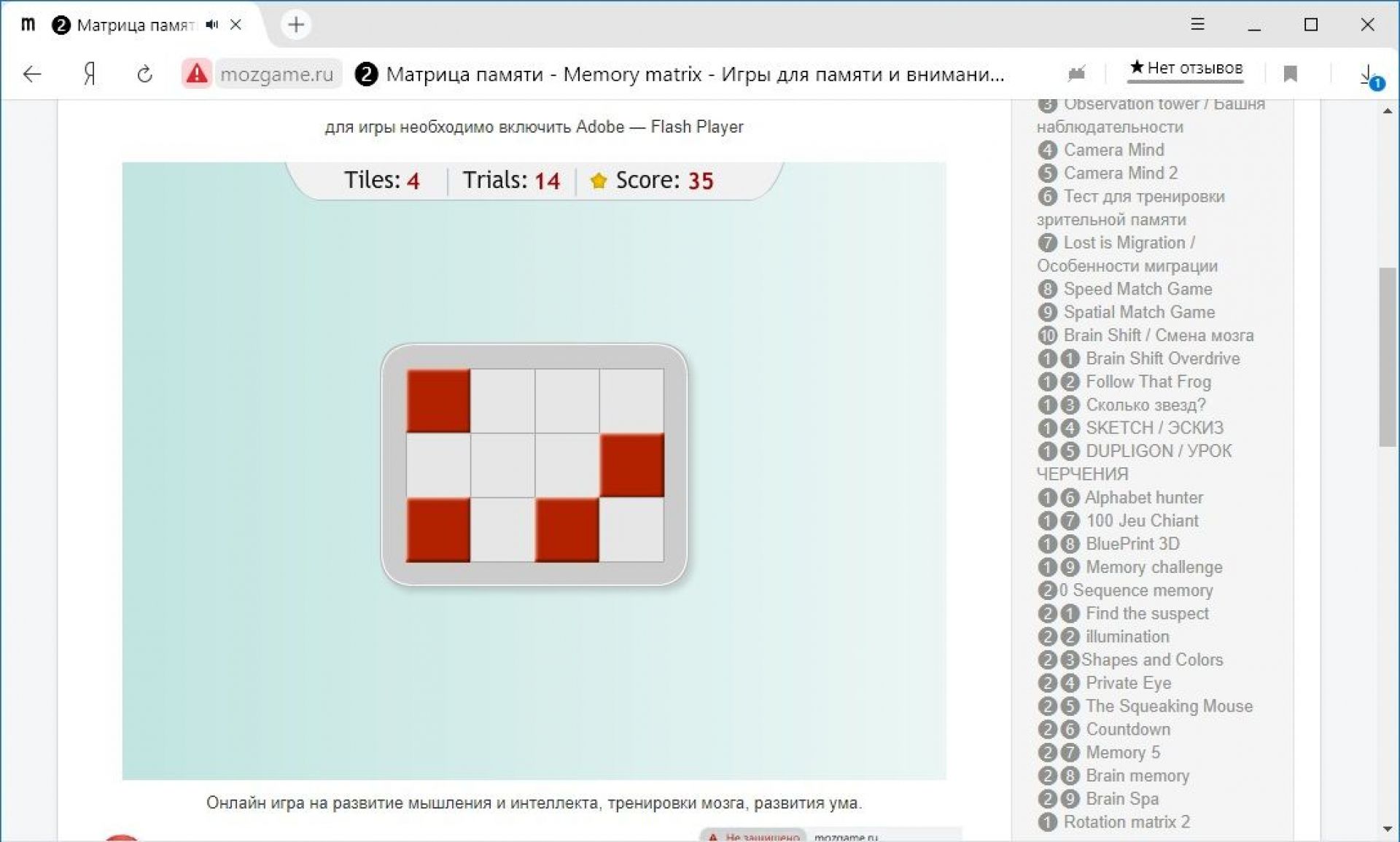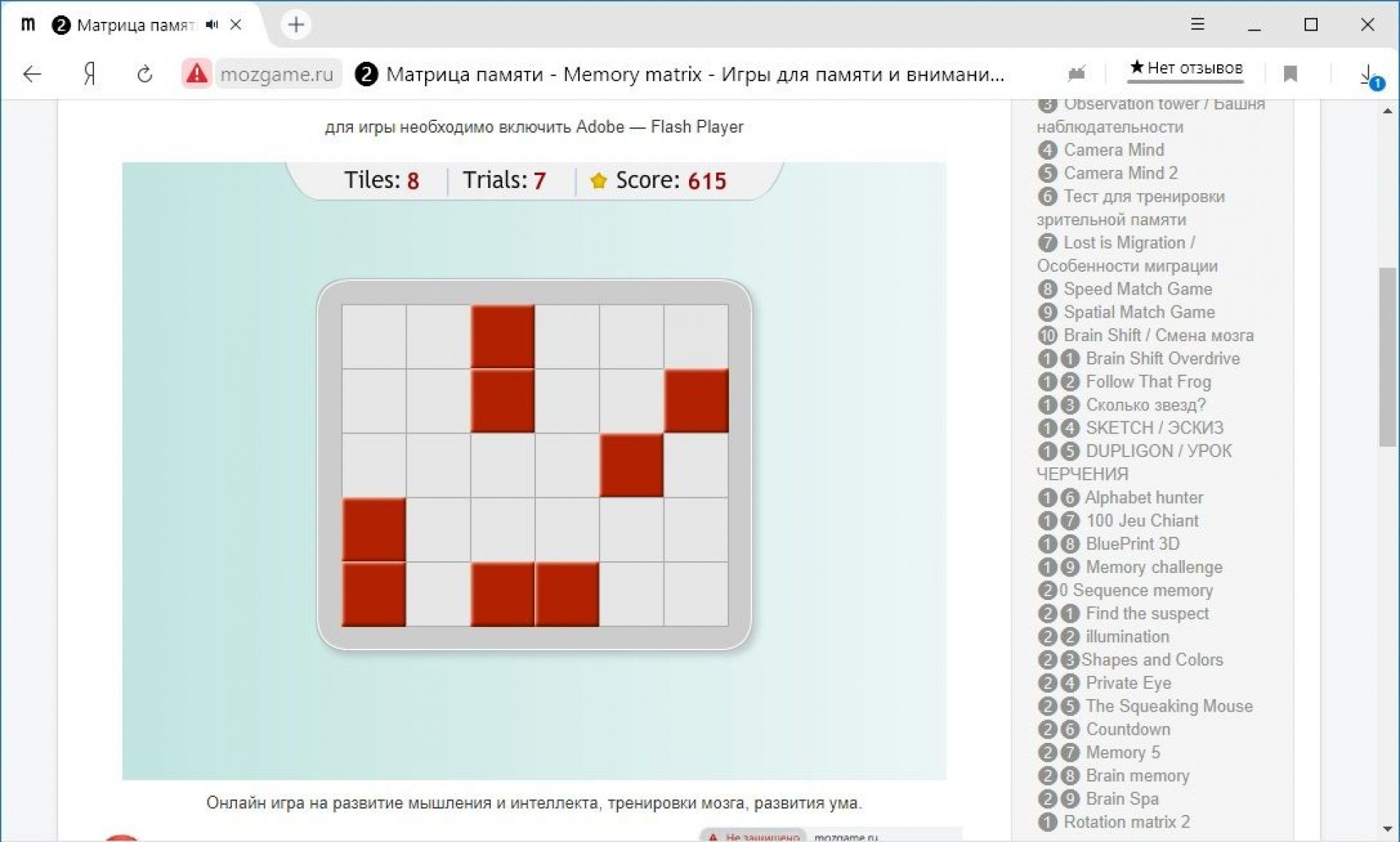 Хороша пам’ять – завжди добре. Однак для того щоб її покращувати – варто тренувати свій мозок. Особливо корисно це буде дітям, які вимушені вчитися дистанційно. Та і дорослим потренувати пам’ять буде корисно. Для цього не варто вчити вірші, хоча і це, звичайно, дає користь. На даному ресурсі можна тренувати зорову пам’ять. Перед вам з’являється поле, розділене на квадрати. На кілька секунд кілька квадратів забарвлюються у червоний. Вам потрібно відтворити розміщення цих квадратів. З кожним пройденим рівнем складність підвищується.