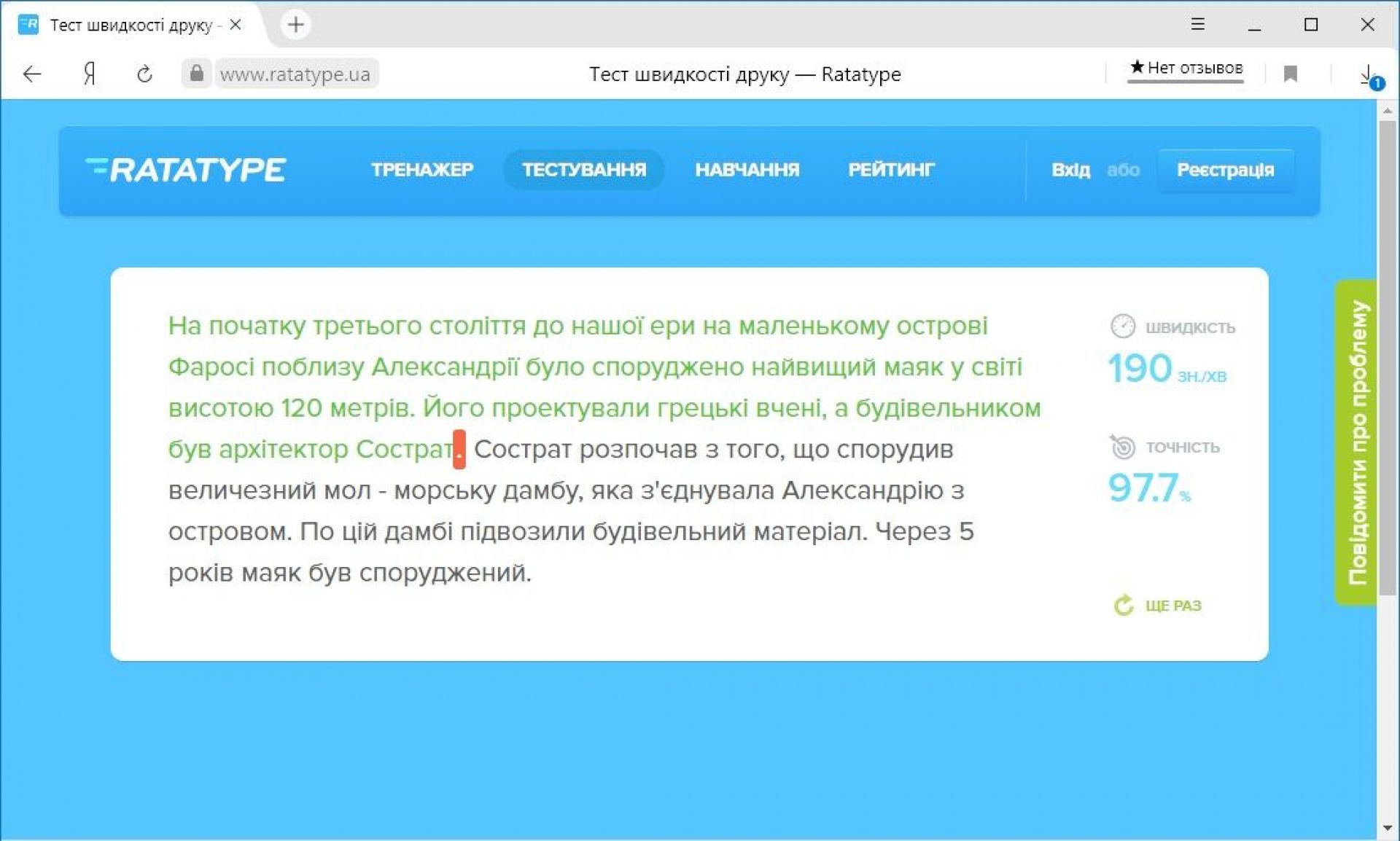 Швидкий набір тексту на комп’ютері – корисна навичка. Цей ресурс дозволяє перевірити, як швидко та наскільки точно ви можете набирати текст. Також є тренажер, щоб удосконалювати навички. Вам потрібно буде набирати текст українською мовою. Різні режими тренувань дозволять вам з часом швидко та точно набирати текст навіть не дивлячись на клавіатуру. Такі ресурси та програми часто використовують на уроках інформатики у молодших класах, щоб діти вміли швидко вводити текст.