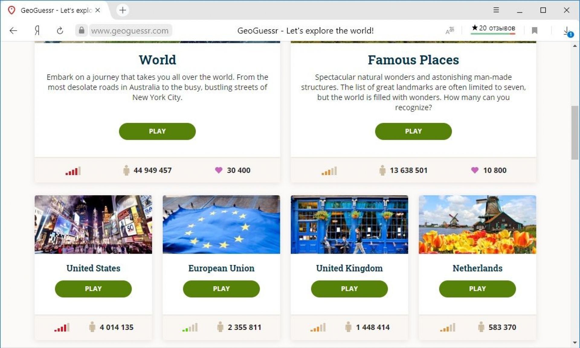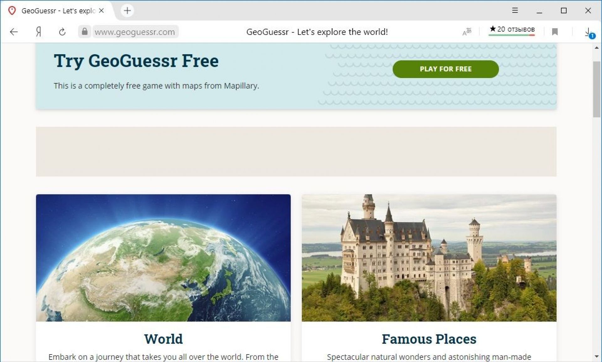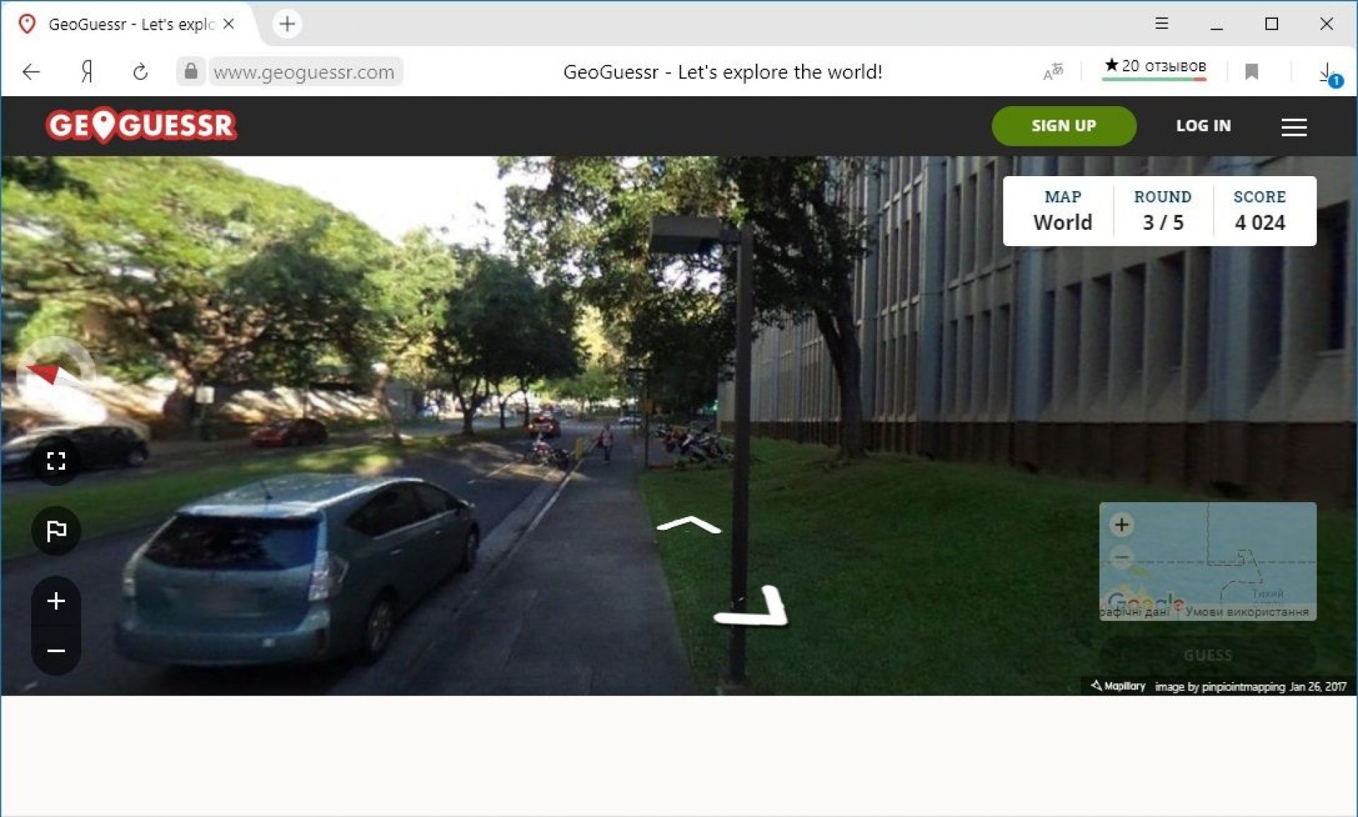 Наступний ресурс більше нагадує гру. Вас «відправляють» у випадкову точку світу. Ви можете подивитись панораму і відзначити місце на карті, де вважаєте знаходиться це місце. Ви можете опинитися в будь якій країні світу. Щоб визначити де ви є, вам доведеться аналізувати побачене – шукати підказки, назви вулиць, зовнішній вигляд мешканців, стилі будинків тощо. Це допомагає не лише розвинути логічне мислення та ерудицію, а і побачити, як виглядають різні куточки нашої планети.