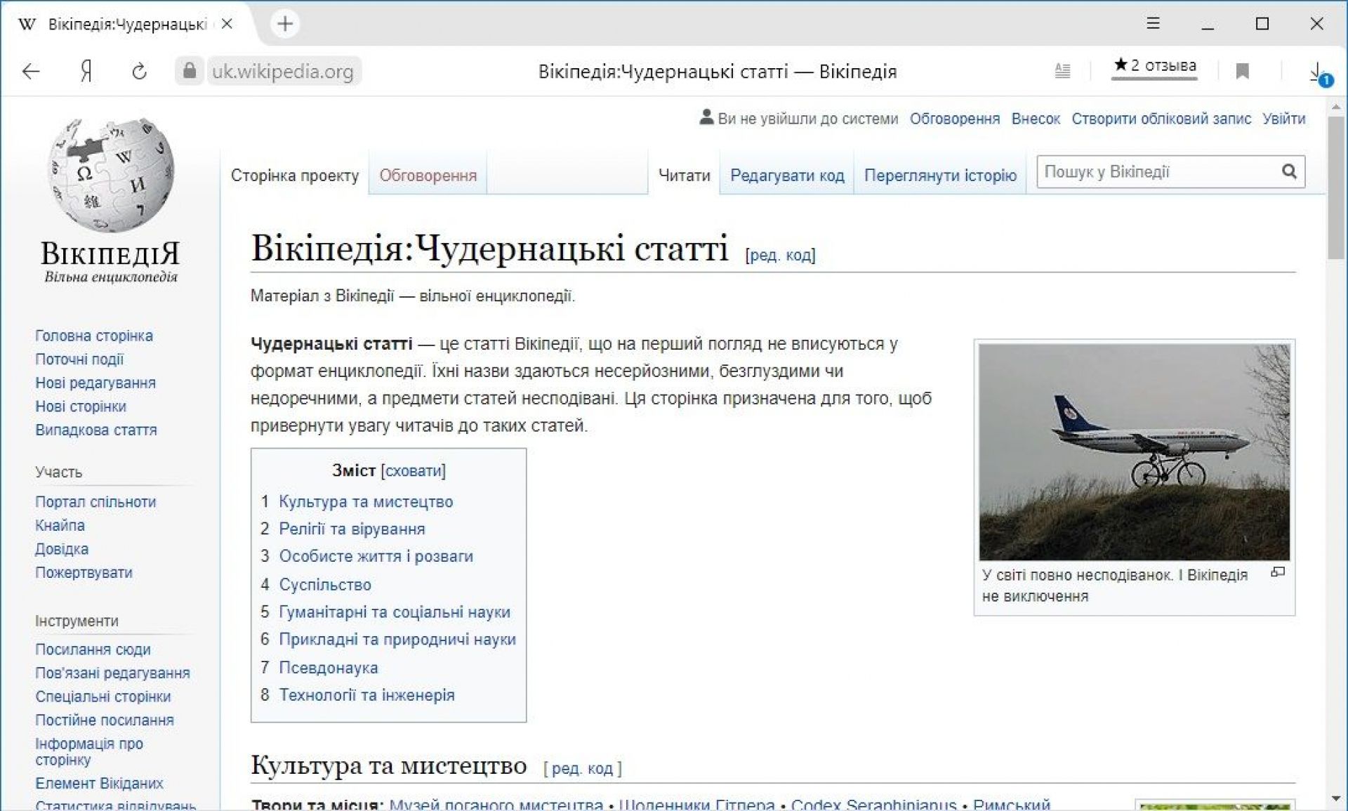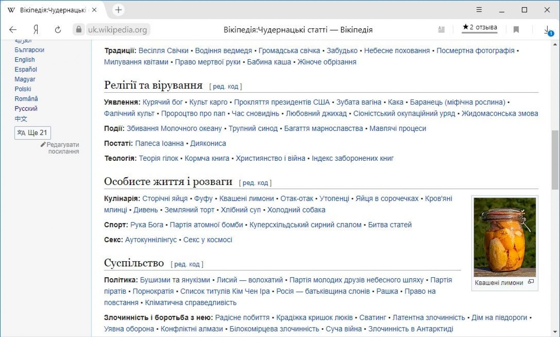 Найбільша онлайн-енциклопедія має свої цікаві сторінки. Якщо ви любите почитати та дізнатися щось нове, цікаве та дивне – можна переглянути незвичні статті «Вікіпедії». На сторінці дивні статті розділені на різні теми. Історія, культура, хімія фізика, особи та багато іншого. Коли ще як не на карантині почитати про квашені лимони, епідемію сміху в Танганьїці, чи танцювальну чуму 1518 року? Кожен може знайти для себе щось цікаве.