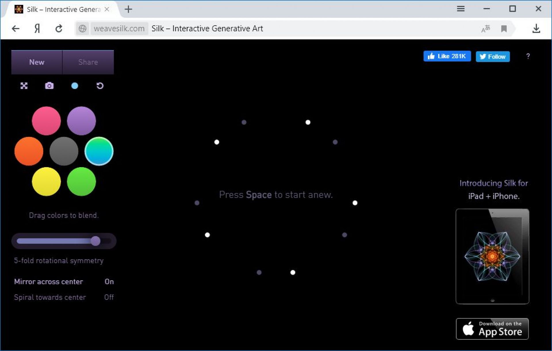 Якщо ви хочете «розвантажити мозк» під час роботи за комп’ютером, вам допоможе сайт, де можна малювати симетричні узори. Вони надують сліди диму. Можна обрати кількість точок, які будуть залишати слід та колір. Кольори можна комбінувати. Таке малювання заспокоює та відволікає. У отриманих малюнках можна шукати образи знайомих нам предметів, істот, тощо.