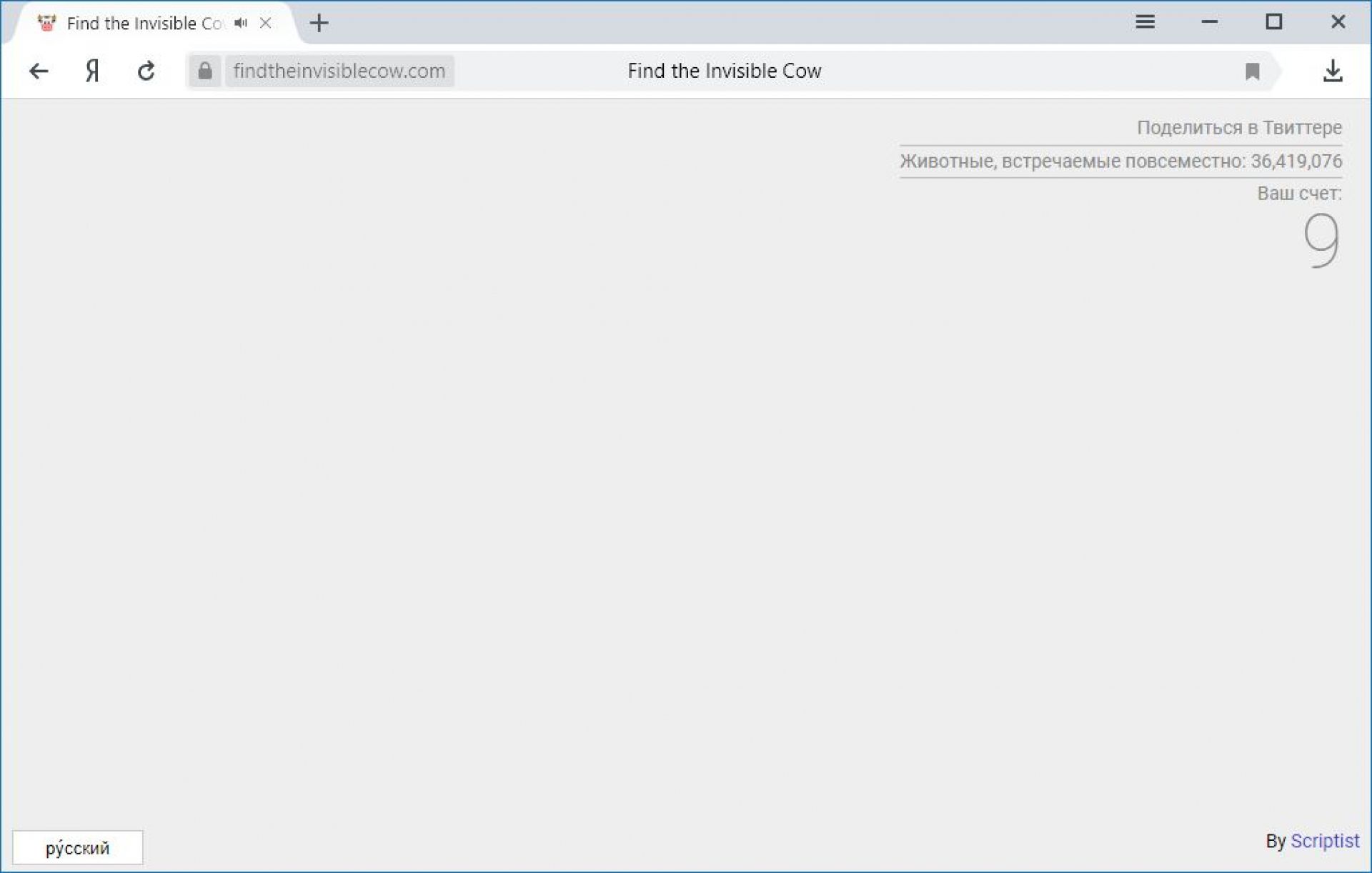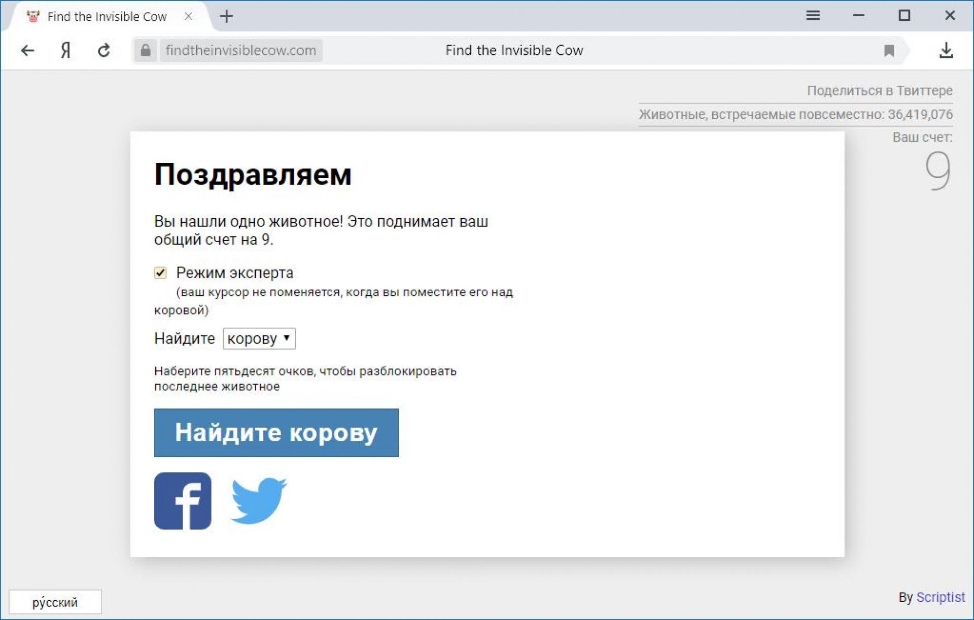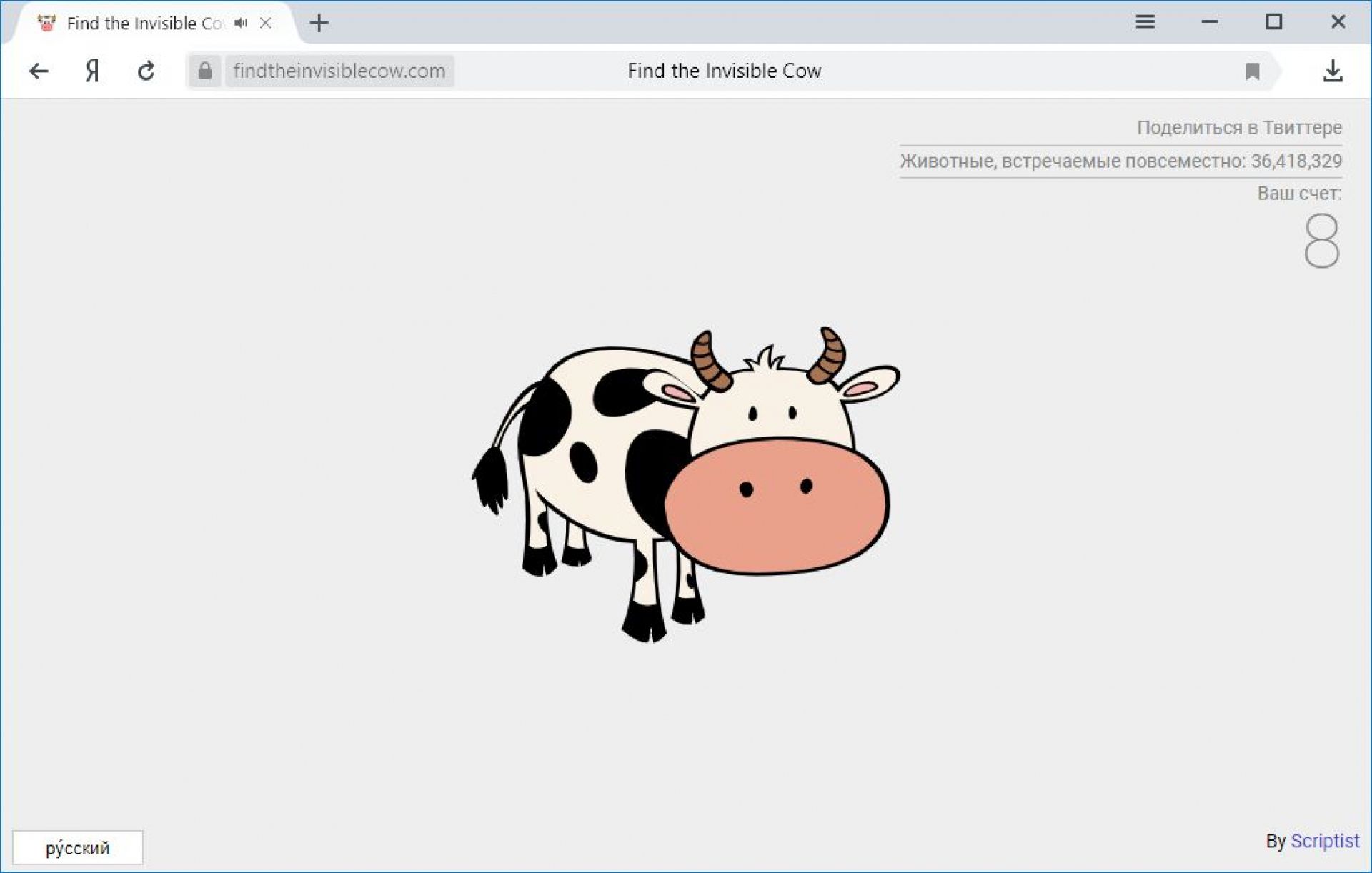 Знайди корову – проста, але водночас цікава гра. Її суть в тому, щоб знайти на екрані невидиму корову. Орієнтуватись вам допоможе крик «Сow, cow, cow». Чим ближче курсор до невидимої корови, тим гучніше крик. Ви також можете підвищити складність. Однак все ж довго грати в цю гру буде нудно, тому вона підійде для того щоб відволіктись від роботи та перепочити кілька хвилин.
