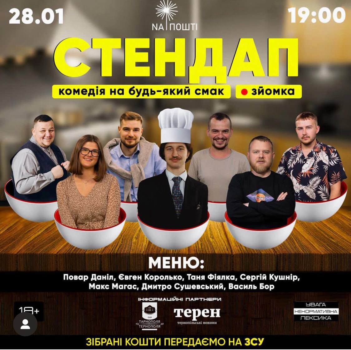 Вам не вистачає позитивних емоцій і ви давно не сміялися від душі? Тоді скоріше купуйте квитки та приходьте на комедію на будь-який смак з кухаром Данілом та стендап-бандою Тернополя. Відбудеться зйомка, а отже для вас звучатиме лише новий, актуальний та перевірений матеріал.
