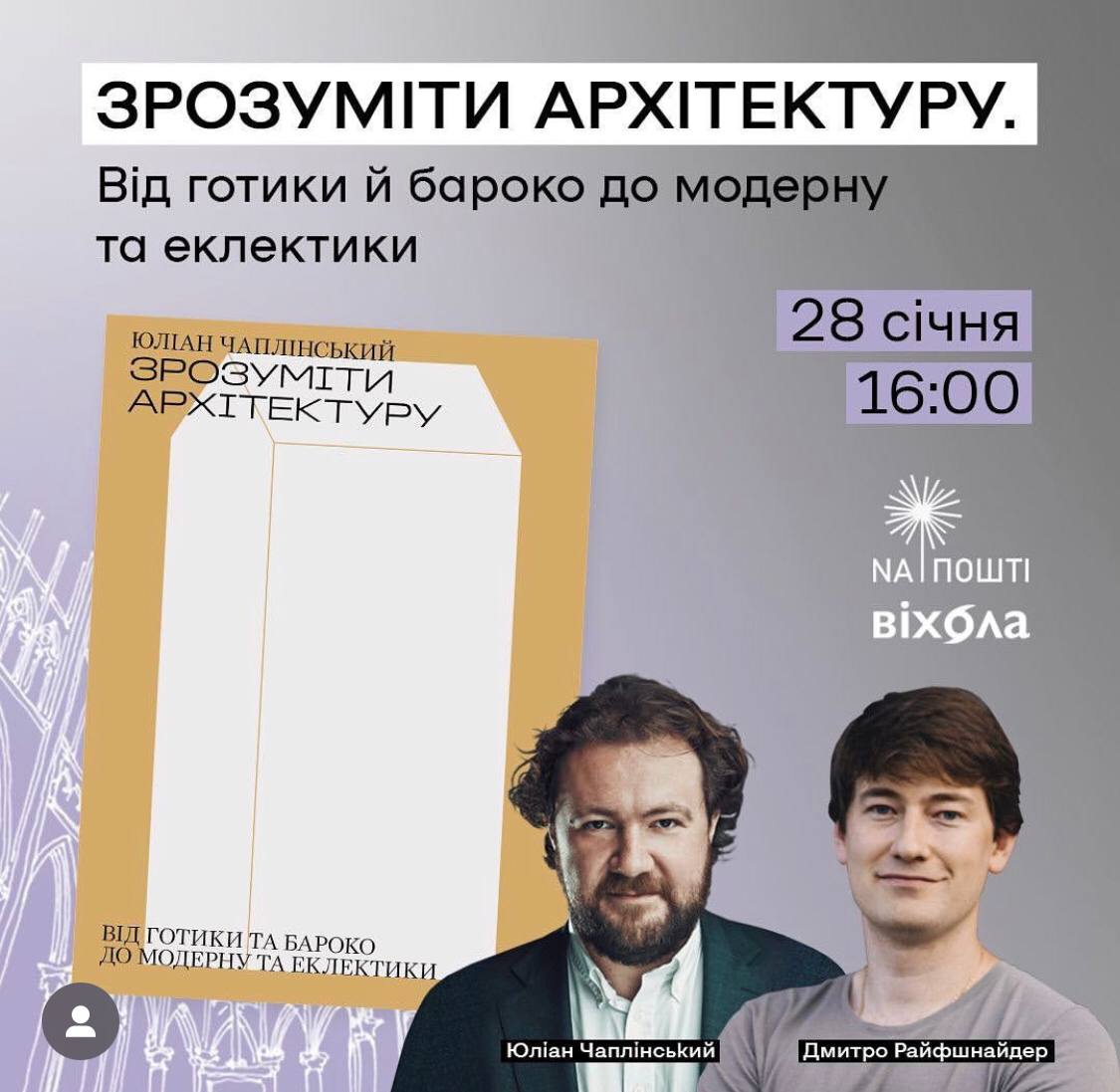Тернополян запрошують на презентацію книжки під назвою «Зрозуміти архітектуру». Автором є архітектор та урбаніст Юліан Чаплінський. Під час зустрічі автор поговорить з присутніми про те, як зрозуміти архітектуру, про красу та стиль, про старе та нове, про відбудову зруйнованого та забудову старих міст.