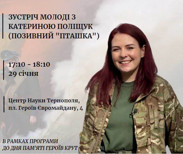 Молодь Тернополя та Тернопільщини запрошують на зустріч із захисницею Маріуполя Катериною Поліщук («Пташкою»). Катю «Пташку» ви точно бачили на відео. Вона у підземеллях металургійного комбінату підтримувала бійців прекрасним голосом і повстанськими співанками – «Зродились ми великої години» та «Батько наш Бандера». Їй 21 рік і вона родом з маленького села на Шумщині.