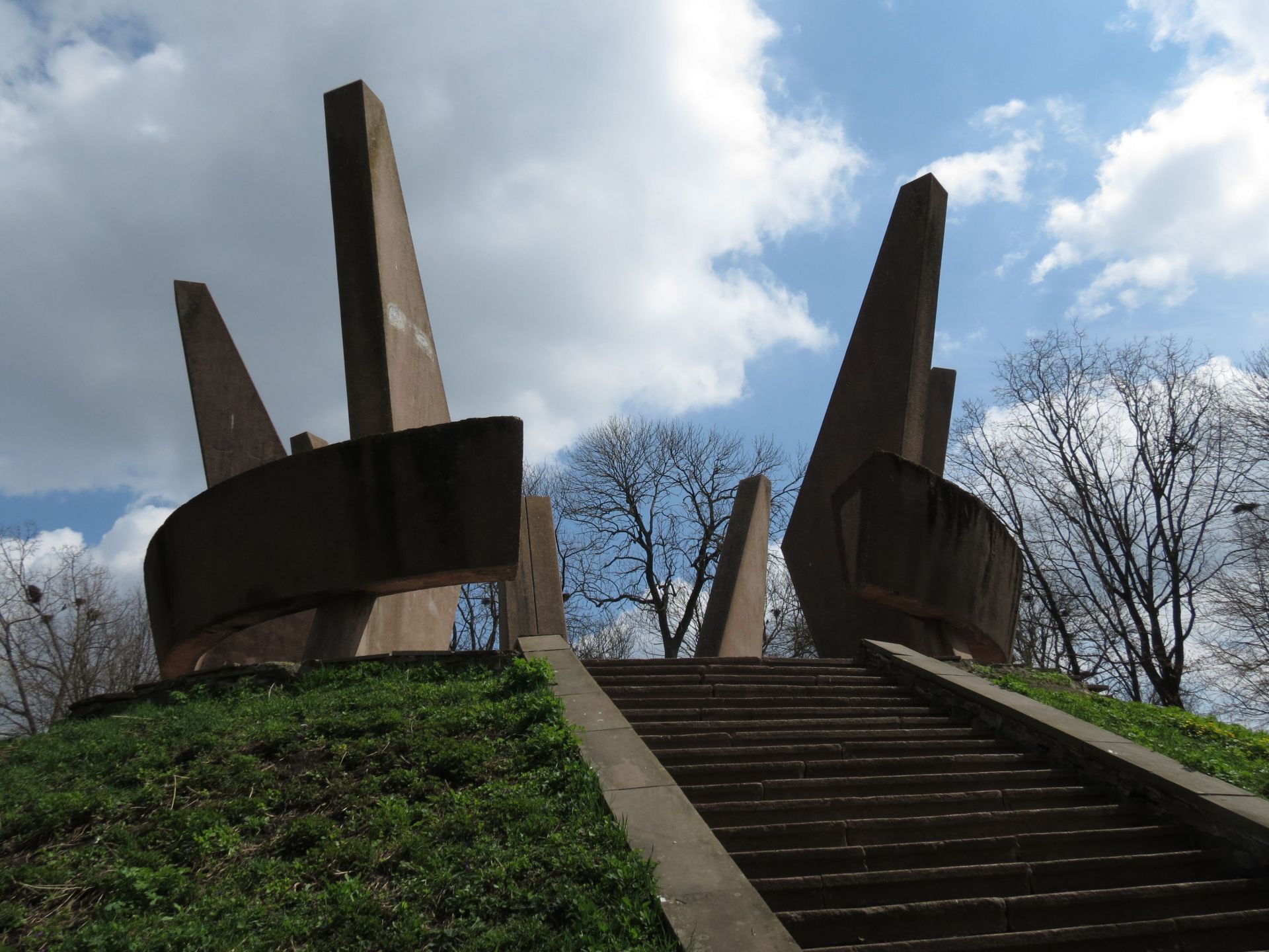 «Вічний» вогонь давно перетворився на руїну та смітник. Сходи на пагорб в аварійному стані – потрібно бути обережним, піднімаючись по них. На пагорбі – композиція із шести бетонних пілонів, що символізують переможний салют. Ці бетонні блоки збереглися в хорошому стані. Однак всі вони розмальовані вандалами.