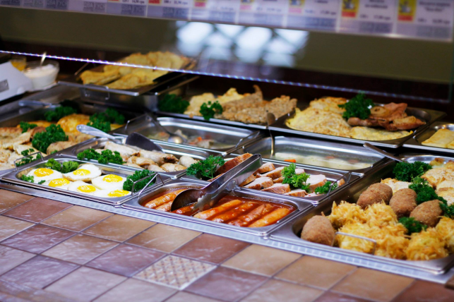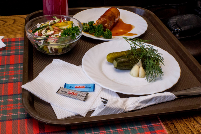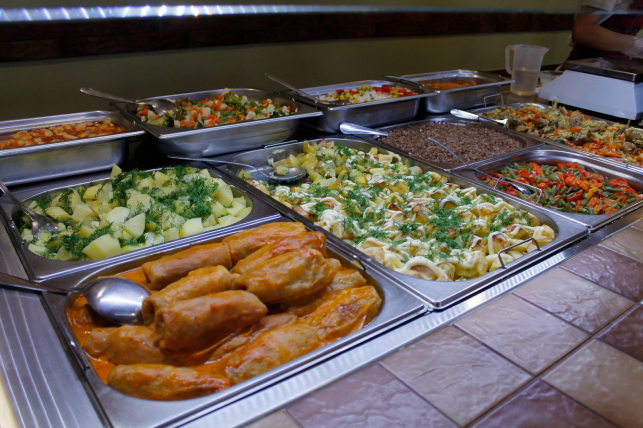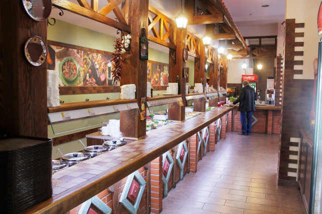Там діяла система «шведська лінія». Відвідувачі брали підніс та йшли вздовж лінії видачі, де їм працівники насипали їжу.