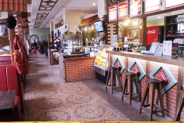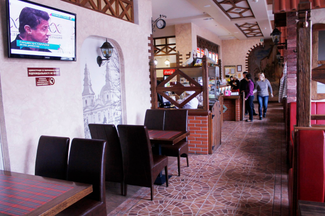 У ресторані були столи та барна стійка. Також велика лінія видачі страв. На стінах були фотографії їжі, меню з цінами. У залі було багато дерев’яних елементів декору. Сніти прикрашали тарілки з розписом в українському стилі та різний тематичний декор.