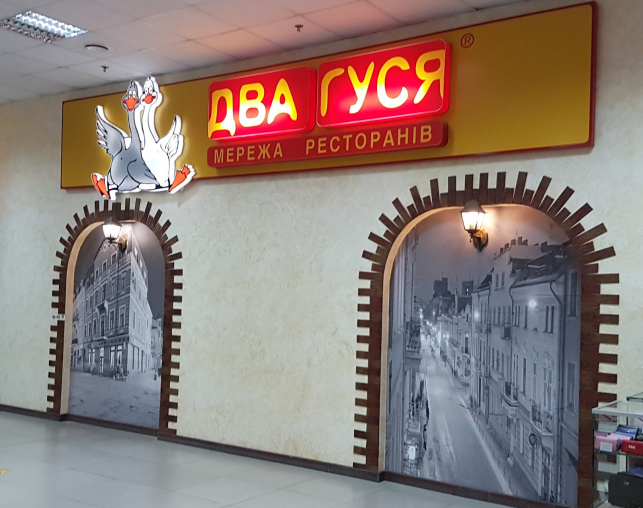 Ресторан «Два Гуся» у Тернополі відкрили 27 грудня 2011 року. Він працював на другому поверсі ЦУМу. Це був один з небагатьох мережевих закладів громадського харчування у Тернополі. Мережа діяла і в інших містах україни та налічувала 16 ресторанів у різних куточках України.