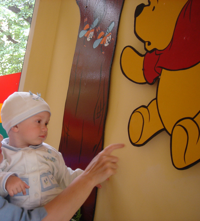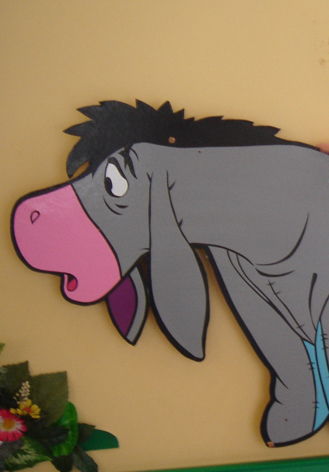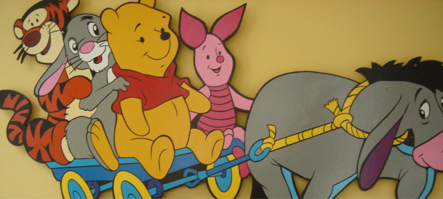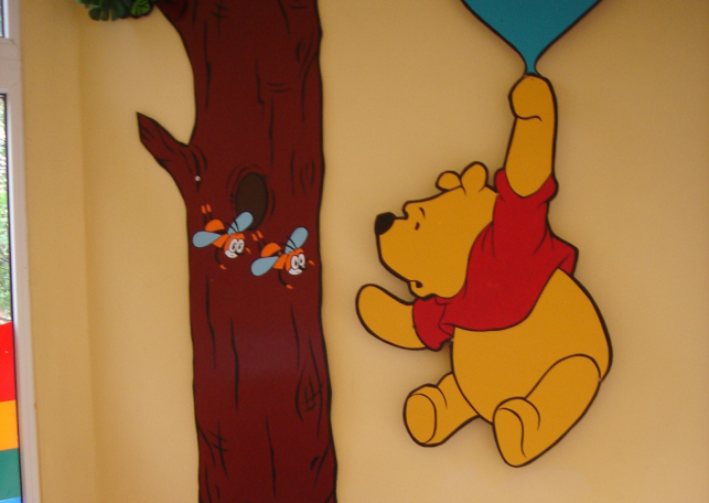 Всередині приміщення були кольорові стіни, які прикрашали персонажі мультфільму про Вінні Пуха.
