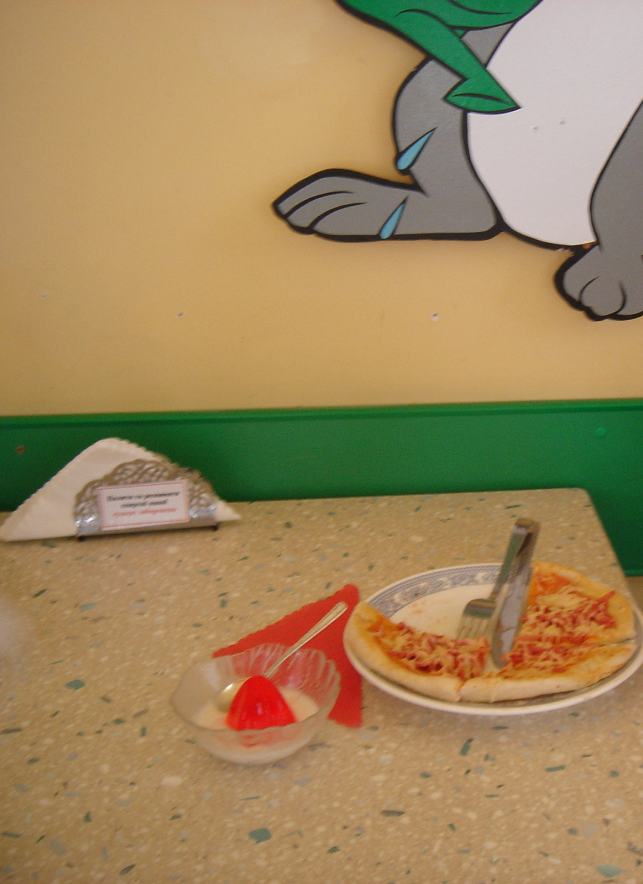 На жаль, знайти ціни не вдалося. В меню була піца. На заготовці викладали кобасу та сир. Також були різноманітні десерти – фруктовий салат, желе «червона шапочка», морозиво, різні фруктові соки тощо.
