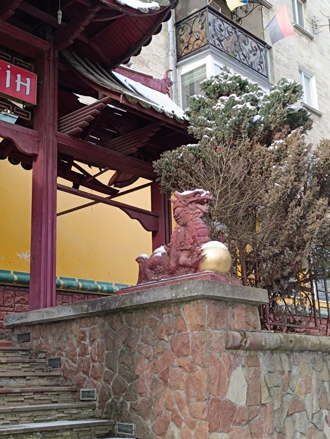 Зовні відвідувачів зустрічали дві скульптури драконів біля сходів, китайська арка, ліхтарики та вивіска, де була написана назва ресторану українською та китайською.