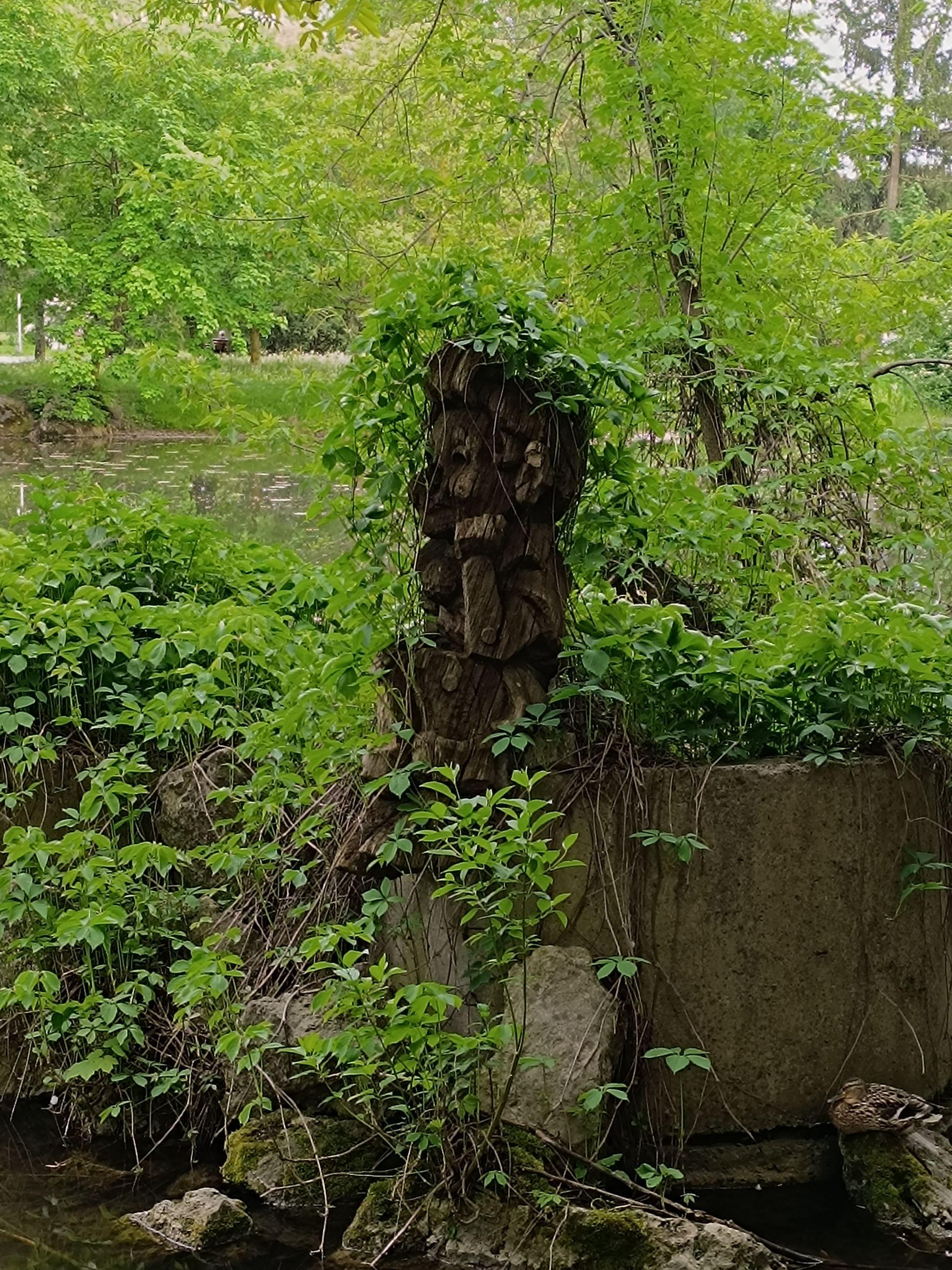 Неподалік в одній з водойм сидить Буратіно. Він вже без носа та обростає чагарником.