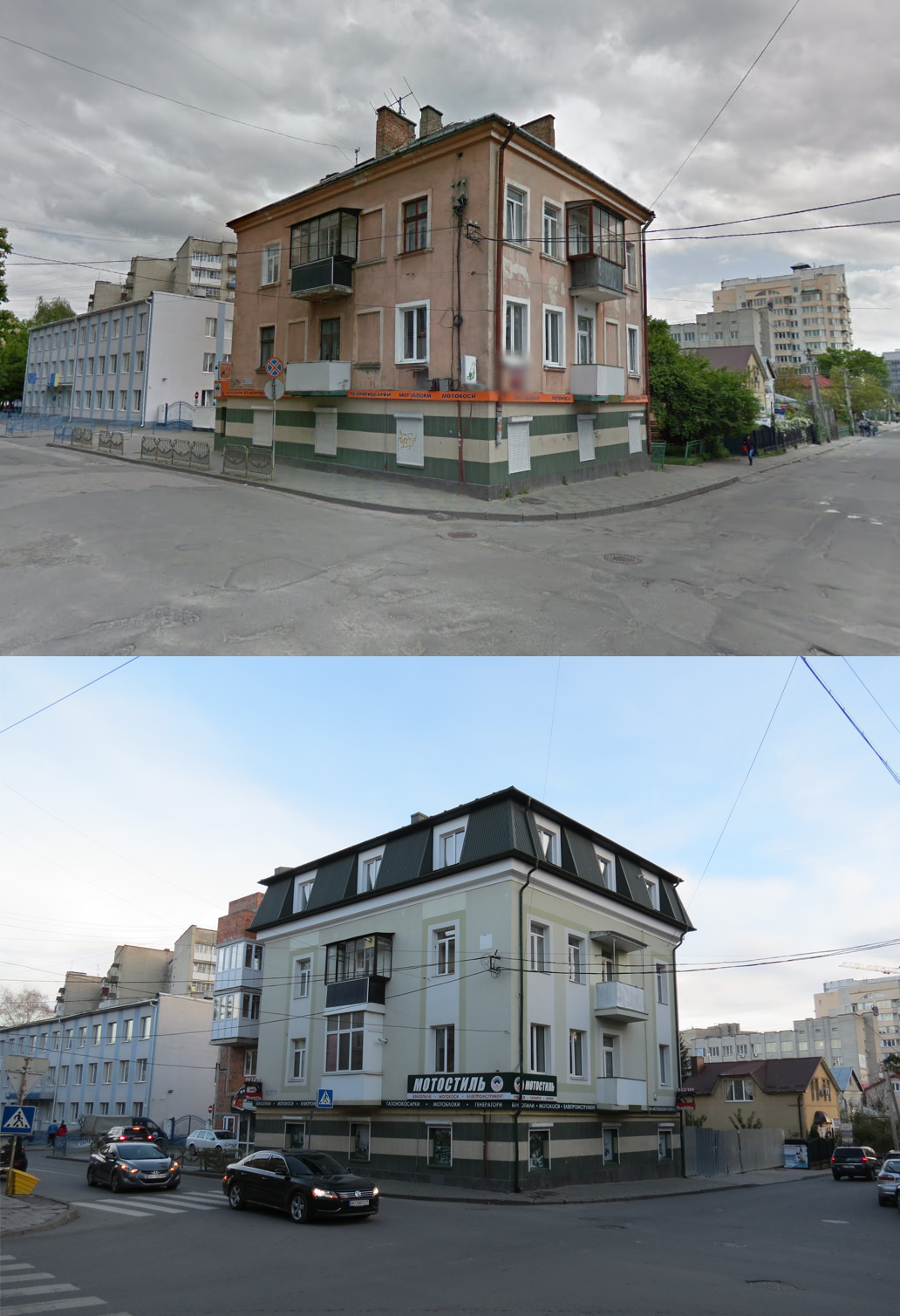 Фасад одного з будинків відреставрували. Також добудували мансардний поверх.