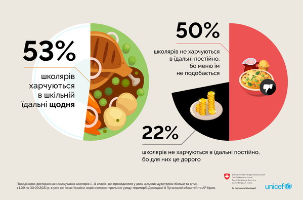 Щодня харчуються в шкільній їдальні понад половина дітей шкільного віку. Ця кількість була б більшою, якби шкільна їжа була доступнішою і смачнішою. Адже для значної кількості учнів регулярно харчуватися в їдальні дорого, а більшість зазначає, що в їдальнях годують несмачно, пише ЮНІСЕФ
