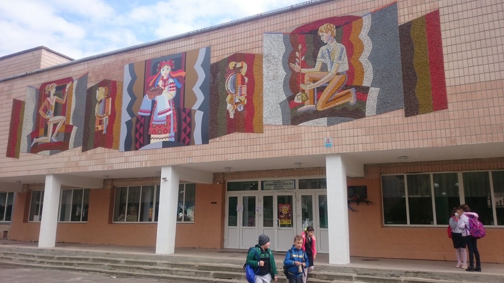Нещодавно на фасаді школи оновили панно з мозаїки. Створили його ще у 1986 році. За 30 років воно почало руйнуватися, то ж керівництво школи вирішило його переробити, а радянську символіку змінити українською.
