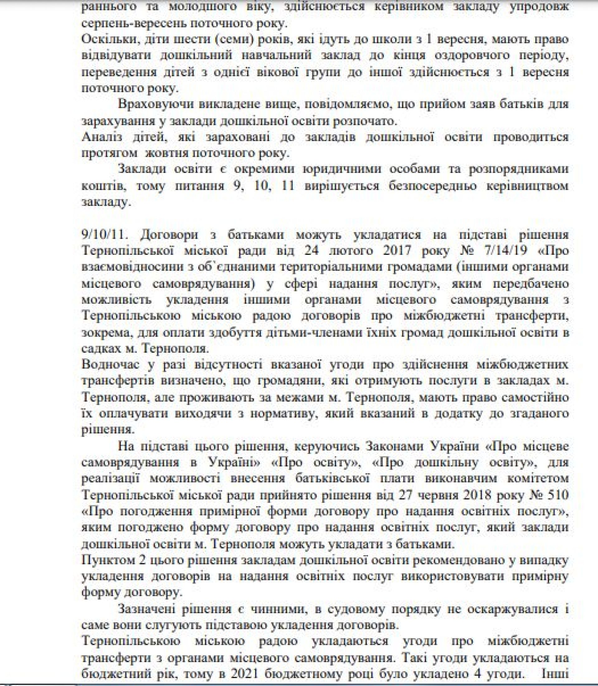— Заклади освіти є окремими юридичними особами та розпорядниками коштів, тому питання вирішується безпосередньо керівництвом закладу, — відповіли нам. — Договори з батьками можуть укладатися на підставі рішення Тернопільської міської ради від 24 лютого 2017 року No 7/14/19 «Про взаємовідносини з об'єднаними територіальними громадами (іншими органами місцевого самоврядування) у сфері надання послуг», яким передбачено можливість укладення іншими органами місцевого самоврядування з Тернопільською міською радою договорів про міжбюджетні трансферти, зокрема, для оплати здобуття дітьми-членами їхніх громад дошкільної освіти в садках м. Тернополя. Водночас у разі відсутності вказаної угоди про здійснення міжбюджетних трансфертів визначено, що громадяни, які отримують послуги в закладах м. Тернополя, але проживають за його межами, мають право самостійно їх оплачувати виходячи з нормативу, який вказаний в додатку до згаданого рішення.