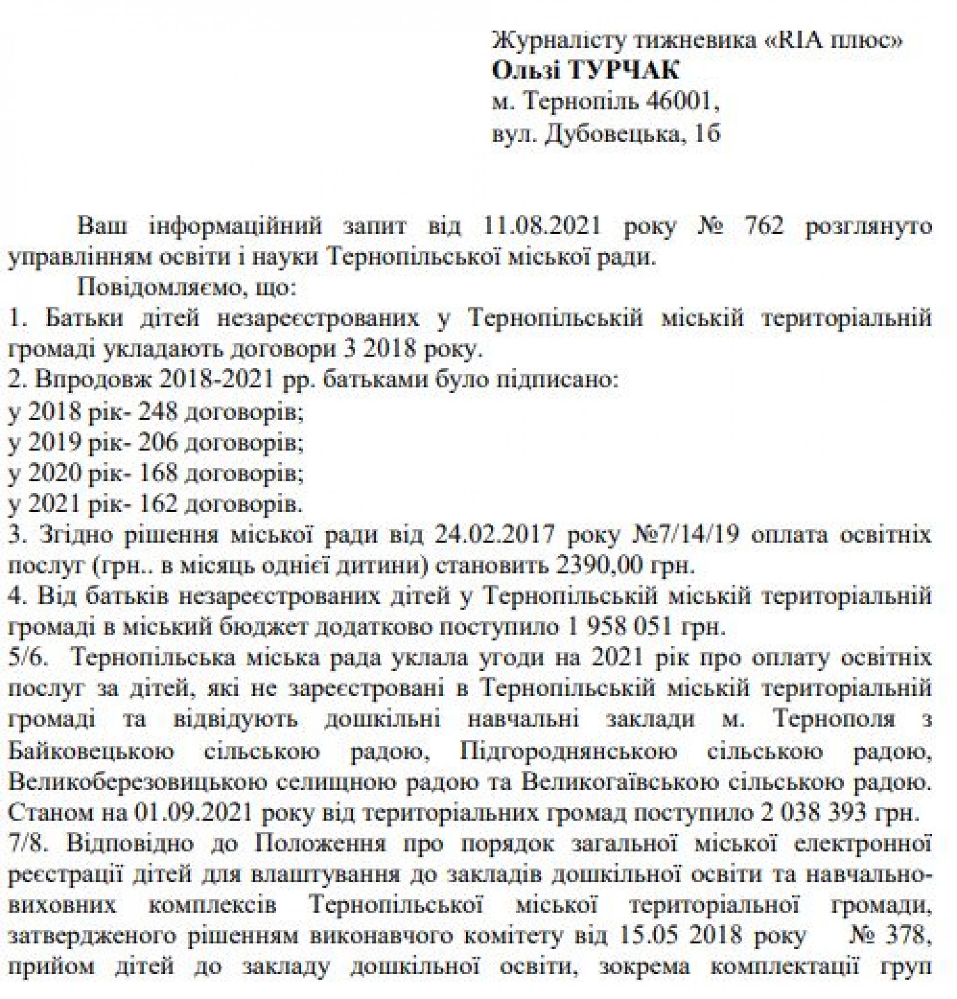 Журналісти “20 хвилин” вирішили дізнатись, скільки ж батьків, які живуть в Тернополі, але не мають реєстрації, уклали договори на оплату за освітні послуги. Для цього відправили інформаційний запит у Тернопільську міську раду. Відповідь отримали аж через 20 робочих днів.