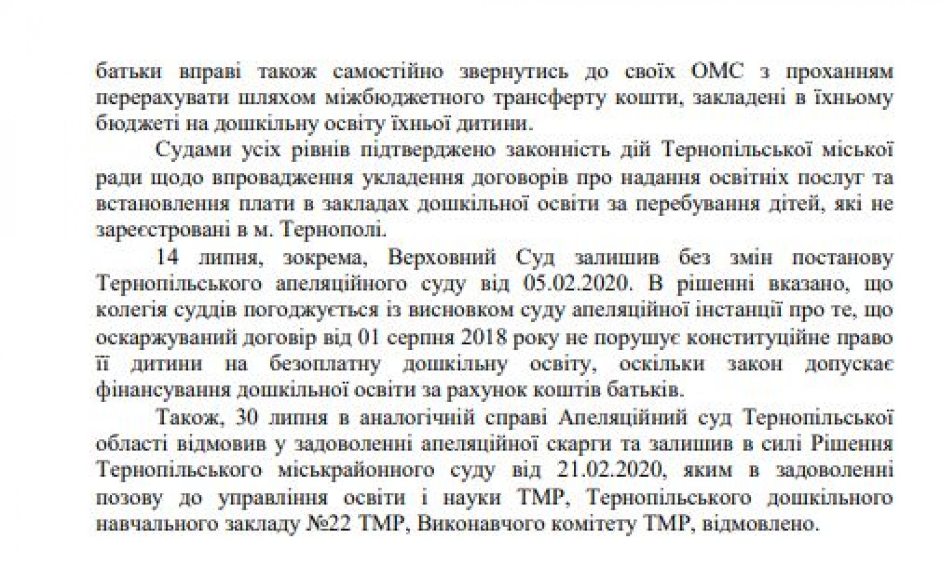 Про скандальний наказ міського управління освіти і науки Тернопільської міської ради від 03 липня 2018 року № 261 «Про встановлення плати за надання послуг у закладах дошкільної освіти для батьків, діти яких не зареєстровані у м. Тернополі» знову заговорили в липні цього року. Тоді на офіційному сайті міської ради з’явилась інформація про те, що суди усіх рівнів підтвердили законність рішення. Адвокат Ростислав Небельський, який захищає інтереси батьків без тернопільської реєстрації, такі повідомлення спростовує. Мовляв, маніпулюють, а рішення суду стосується зовсім іншого, а саме повернення сплачених коштів.