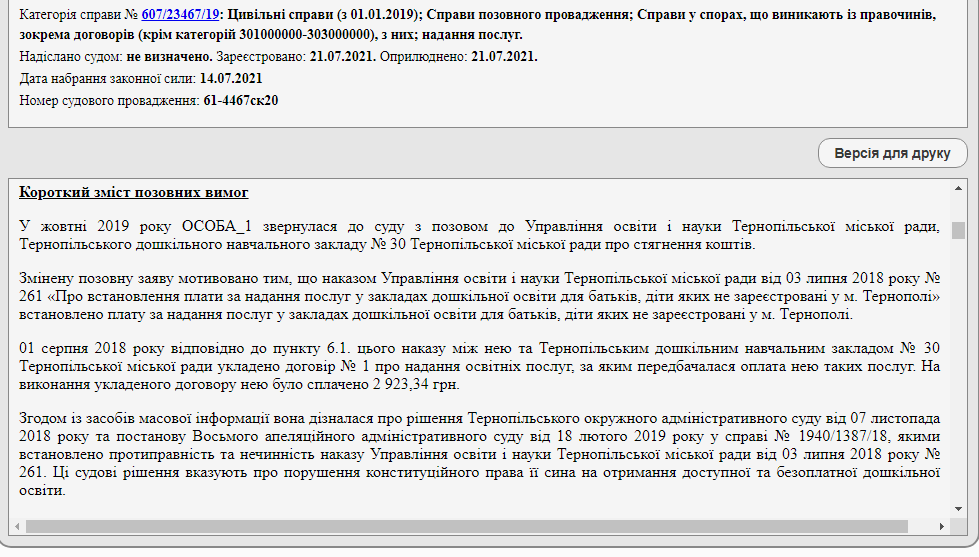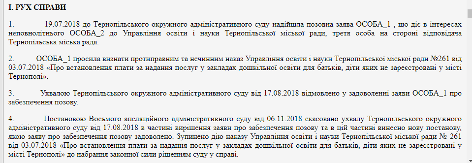 Ми знайшли рішення Верховного суду, на яке посилаються у міськраді. З нього відомо, що йдеться про справу однієї з мам вихованців Тернопільського ДНЗ №30. Дата