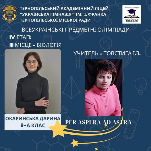 Дарина Окаринська, учениця 9-А класу Тернопільського академічного ліцею «Українська гімназія» ім. І. Франка, посіла ІІІ місце на Всеукраїнській учнівській олімпіаді з біології, яка цьогоріч проходила у Львові.