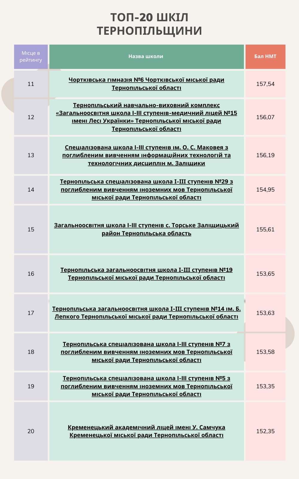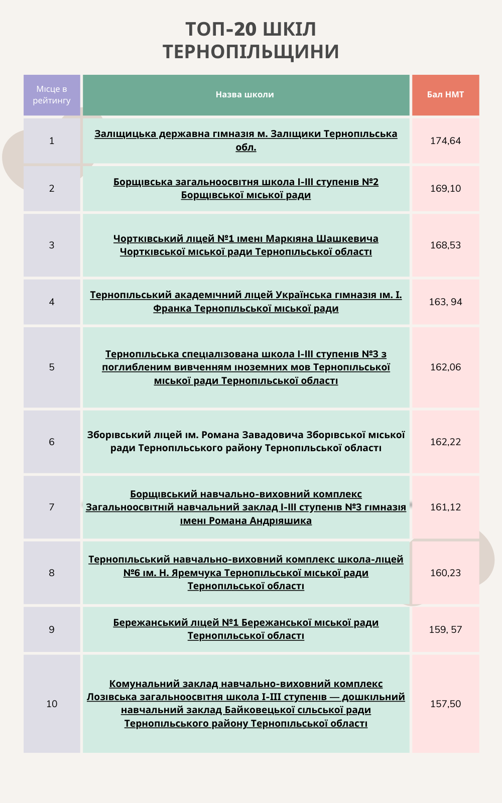 - Освітній портал Education.ua створив рейтинг шкіл Тернопільщини за результатами національного мультипредметного тесту 2024 року.