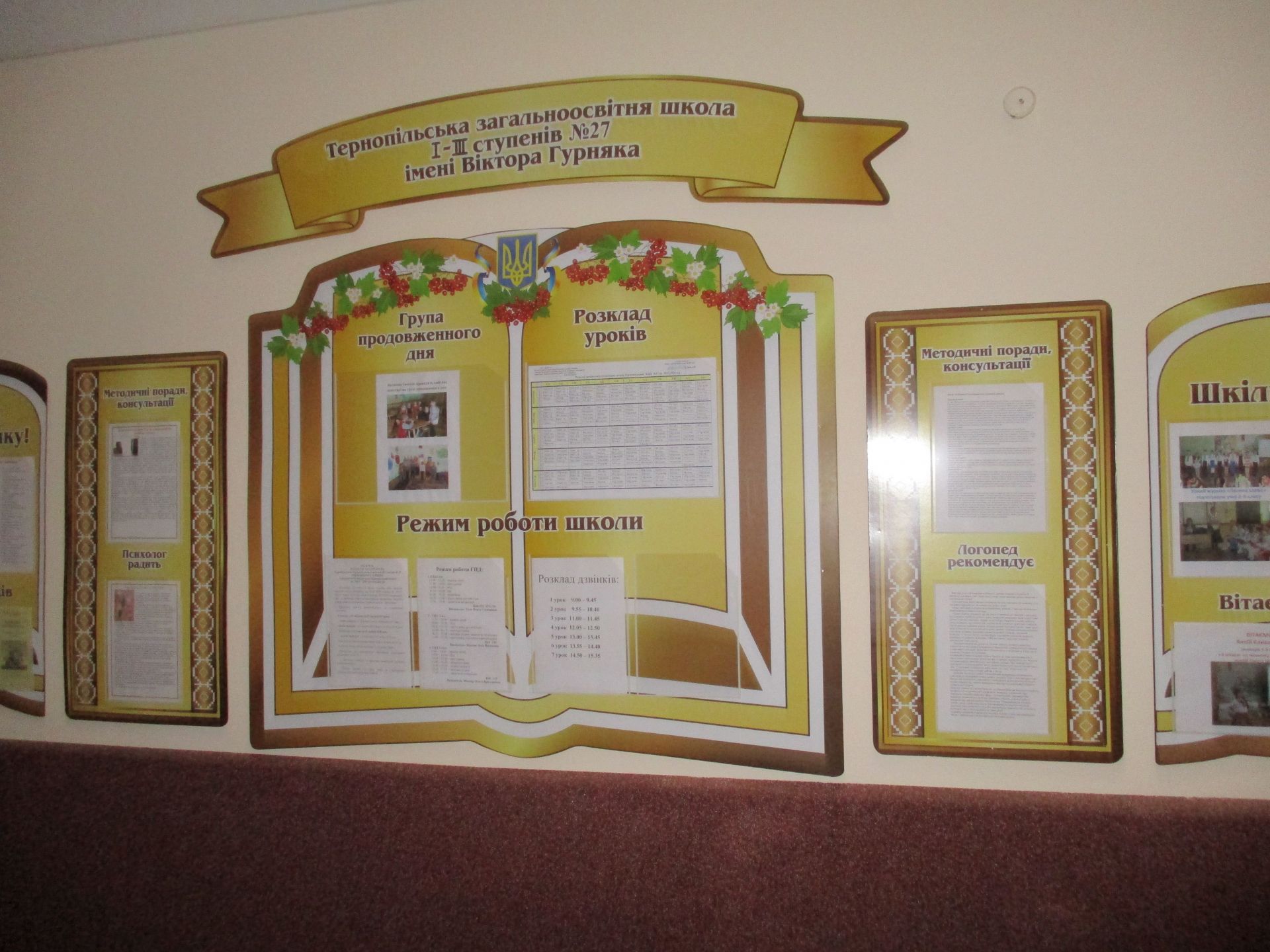 У фойє – куточок Небесної Сотні та міні-музей Віктора Гурняка. До речі, у школі навчається його молодший брат. З-поміж «родзинок» цього навчального закладу – величезний спортзал, два класи хореографії, актовий зал із двома веселками на стінах, спальня для першокласників та ігрова кімната з бібліотекою. На стінах коридорів молодшої школи – величезні малюнки, а на підлозі – ігри. Тут є клас з ромашковим полем, хмаринками і журавлиним ключем у небі. Коридори в старшій школі тематичні – з географічними картами, з погруддям Тараса Шевченка, портретами письменників тощо. А ще учні школи № 27 мають спеціальні щоденники.