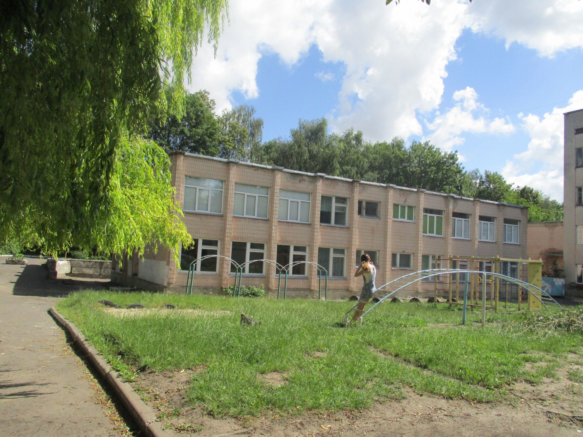 Перед парадним входом до школи є чимале подвір’я, де на асфальті синьо-жовтими фарбами намальована карта України, а над нею рядки про Батьківщину з поезії Володимира Вихруща. Позаду школи знаходиться невеличкий стадіон, а трохи вище ще один, котрим користуються спільно зі школою-ліцеєм №15.
