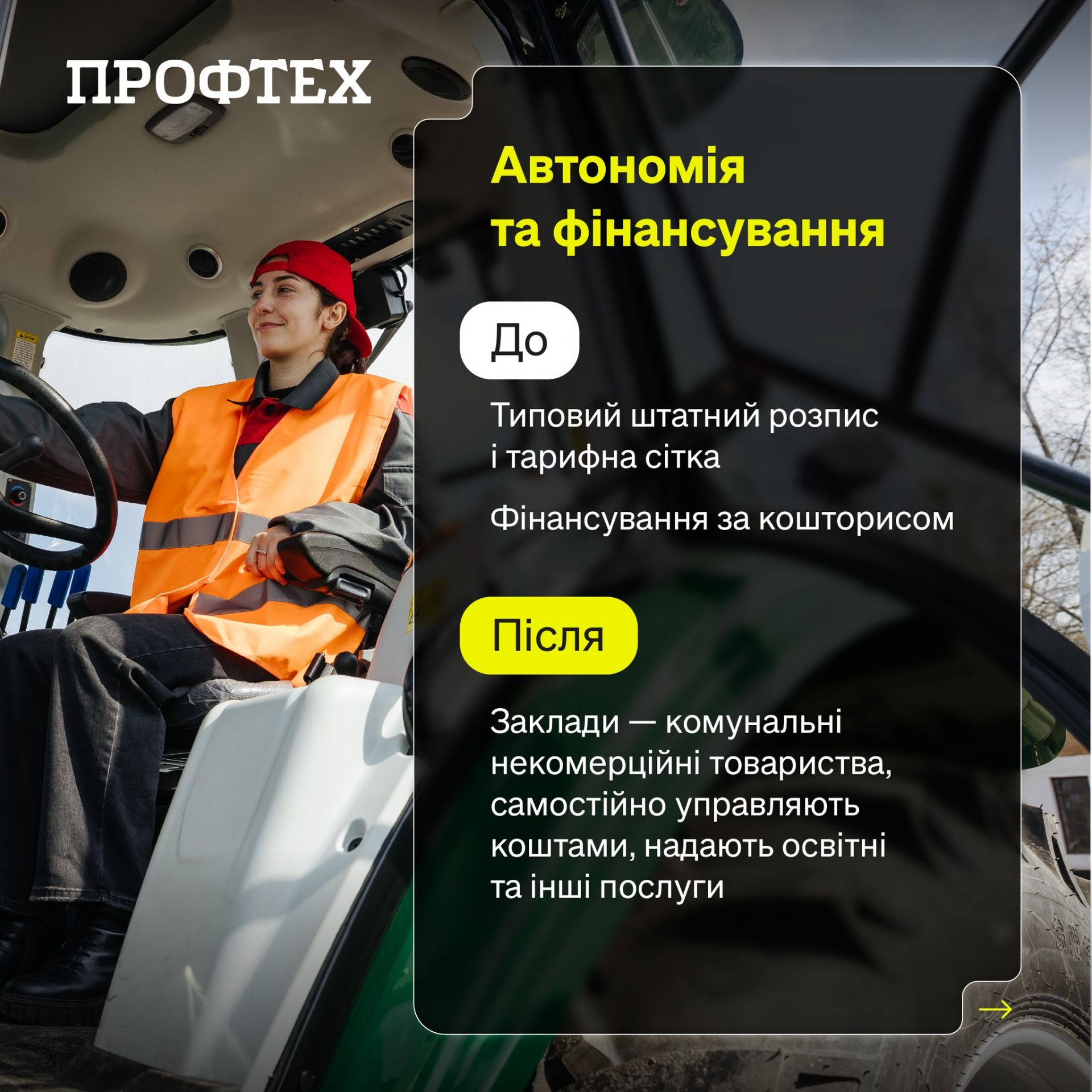 Професійні коледжі працюватимуть у формі некомерційних товариств, що дасть можливість відмовитися від тарифної сітки та типового штатного розпису, а також вільно розпоряджатися власними надходженнями. Фінансова автономія дасть змогу підвищити зарплати для найкращих співробітників закладів, передусім для майстрів виробничого навчання.