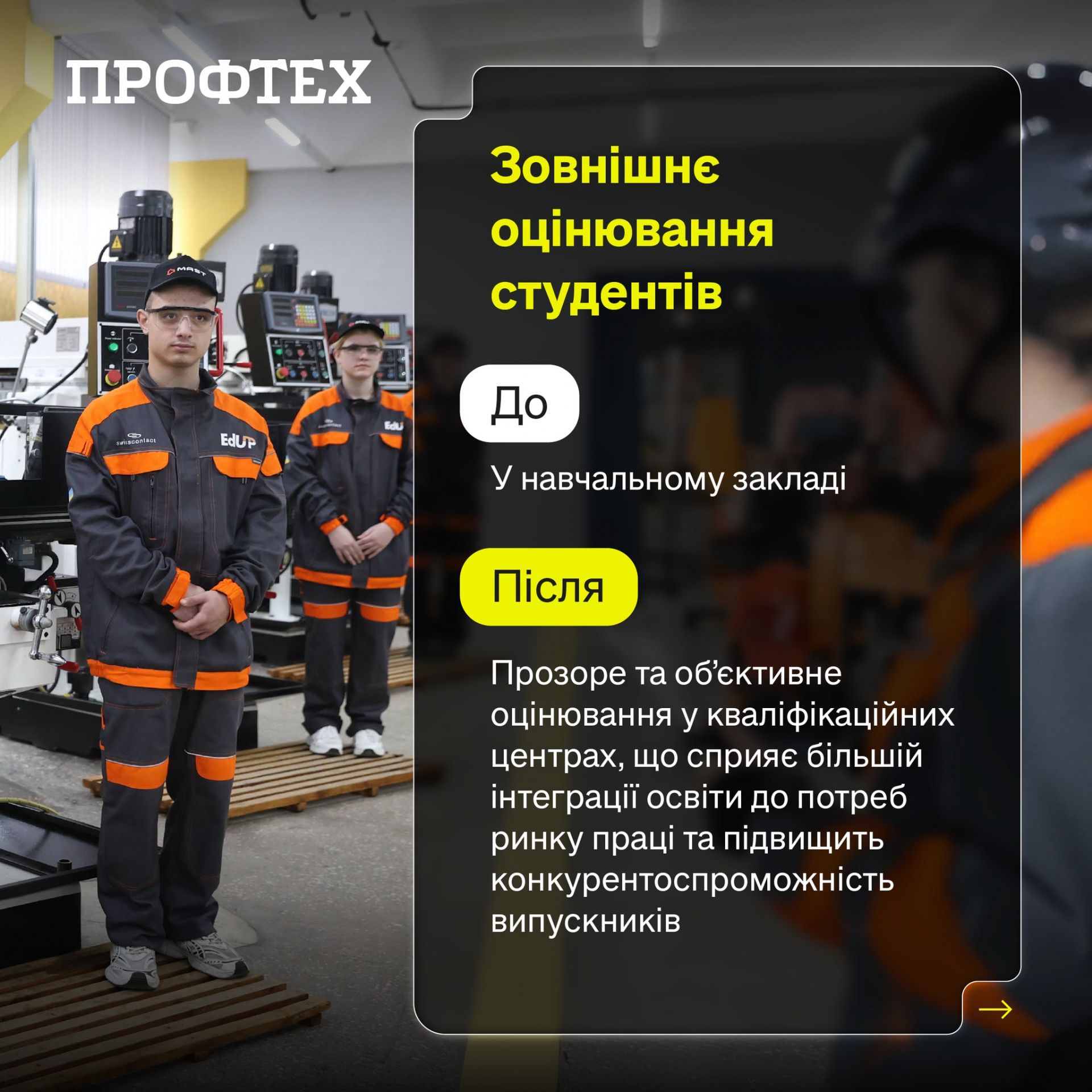 За декілька років випускників чекатиме зовнішнє оцінювання результатів навчання, яке будуть проводити незалежні кваліфікаційні центри. Це підвищить якість підготовки фахівців, оскільки дипломи вже не видаватимуть без такої перевірки знань.
