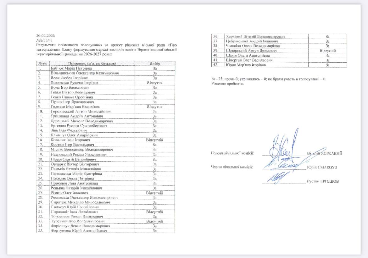 Проєкт рішення «План формування мережі закладів освіти Тернопільської громади на 2026-2027 роки» затвердили на сесії міської ради 20 січня. У додатку до рішення визначили 41 освітній заклад, який матиме статус гімназії, ліцею або початкової школи.