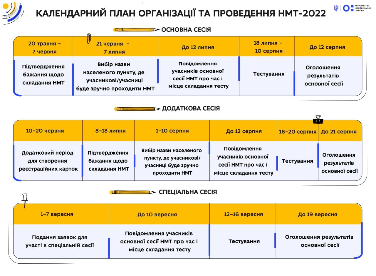 До 12 липня 2022 року для зареєстрованих учасників з’явиться можливість завантажити зі своїх Інформаційних сторінок запрошення-перепустки, де буде зазначено дату, час і місце проведення НМТ. Учасники ж інших сесій НМТ матимуть змогу дізнатися про дату, час і місце проведення тестування до 12 серпня (додаткова сесія) і 10 вересня (спеціальна сесія).
