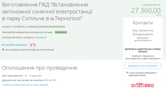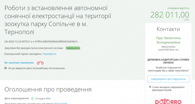 Відповідні закупівлі щодо міської ферми оголосило КП «Об'єднання парків культури і відпочинку м. Тернополя». Як йдеться на сайті Prozorro, спершу виготовили проєктно-кошторисну документацію. Вона обійшлася в 27 360 грн. Її розробило ТОВ «Енергія проєкт».