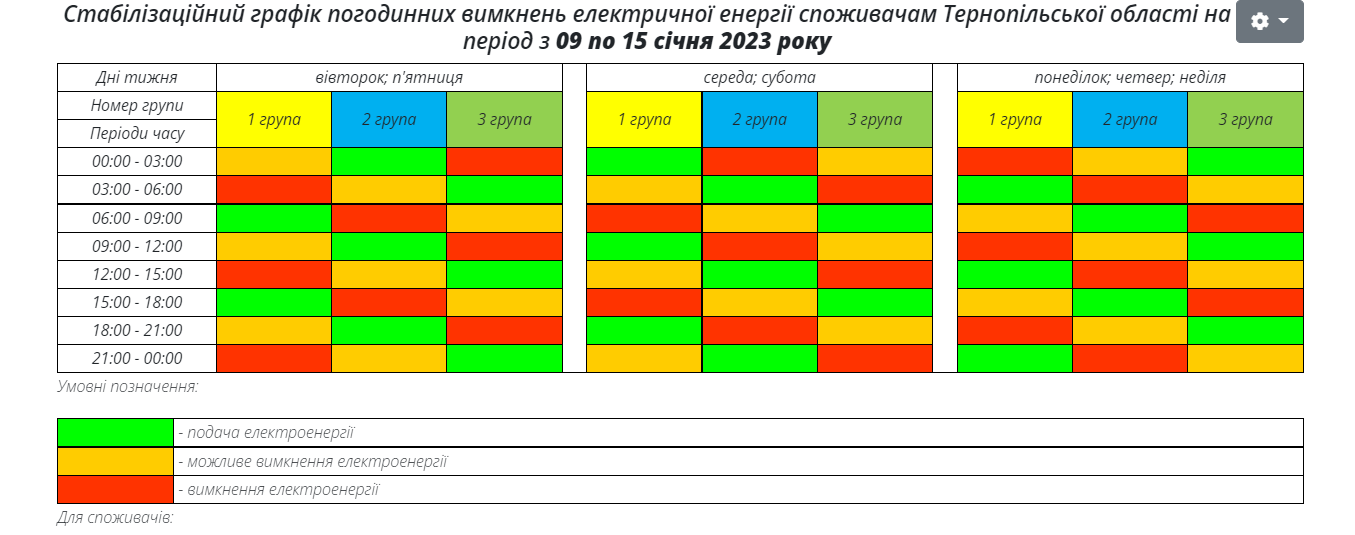 А також ВАТ «Тернопільобленерго» надав вже графік стабілізаційних відключень електроенергії, що мають діяти до 15 січня 2023 року.