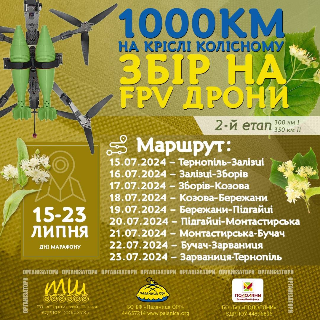Триває другий етап акції «1000 км на кріслі колісному» тернопільського волонтера Сергія Цитрикова. Його мета — зібрати кошти на FPV дрони для ЗСУ. Маршрут благодійного заїзду складає 350-400 км і пролягає через дев’ять населених пунктів Тернопільщини. Їх Сергій відвідує із 15 до 23 липня.