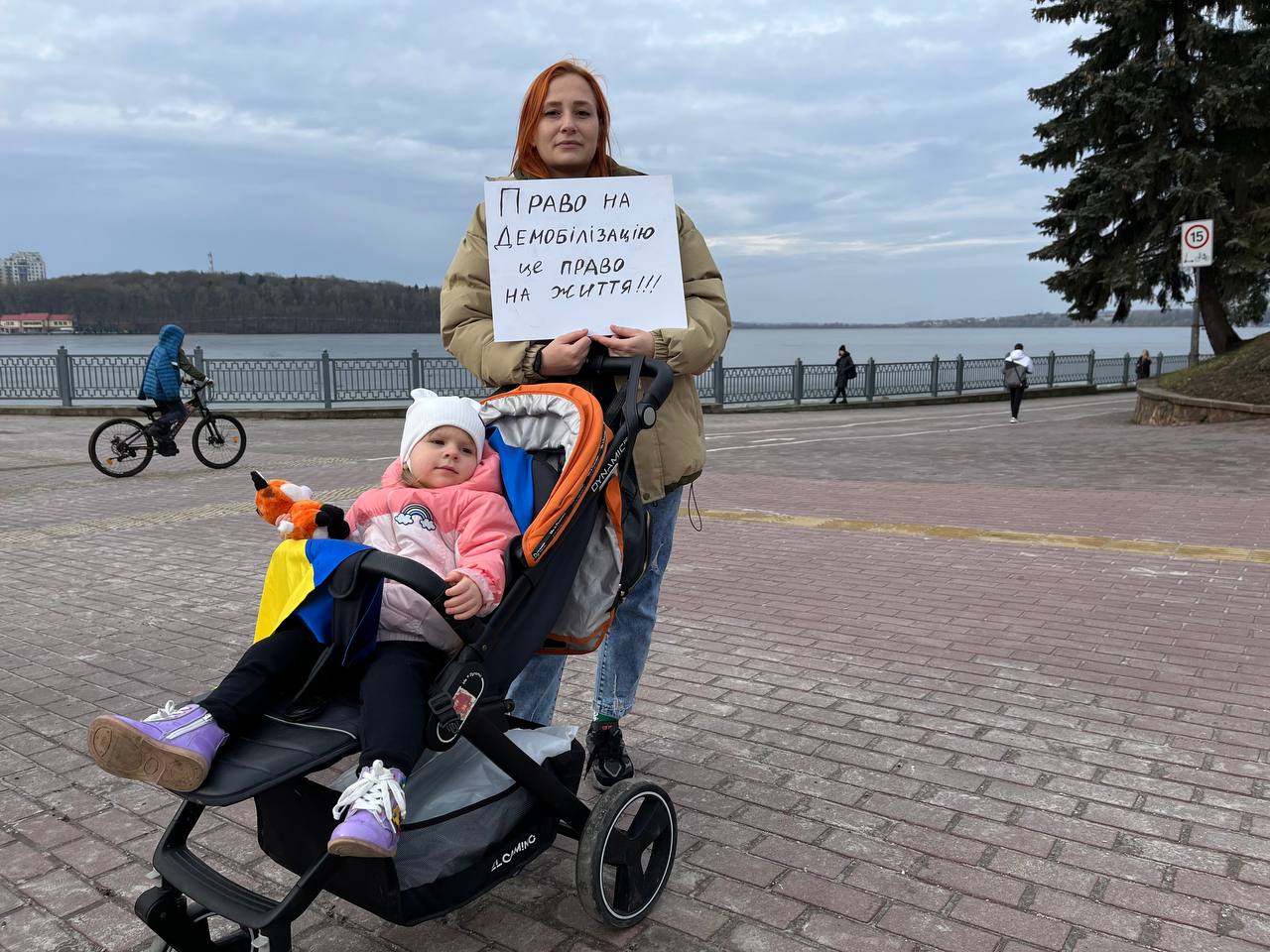 Серед тих, хто вже всьоме долучається до мітингу і тернополянка Олександра разом з маленькою донечкою. Дівчинку обмотали в українських прапор, а мама тримає табличку з написом «Право на демобілізацію – це право на життя».