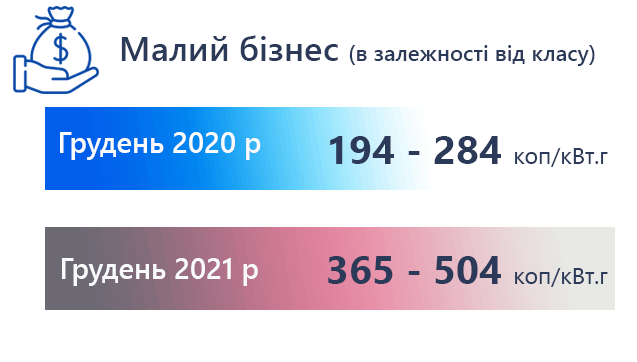 У грудні минулого року малий бізнес, в залежності від класу, платив за електрику від 194 до 284 коп/кВт.г., а в грудні цього року — від 365 до 504 коп/кВт.г., що майже вдвічі дорожче.