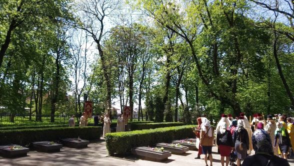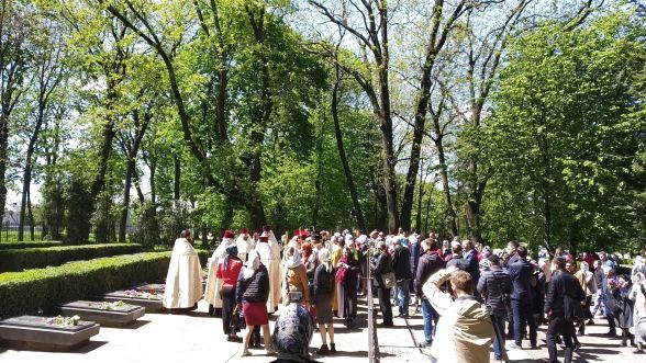 Священики та люди, які прийшли помолитись разом із ними, поклали квіти до меморіалів на Алеї Слави та відслужили поминальну панахиду.