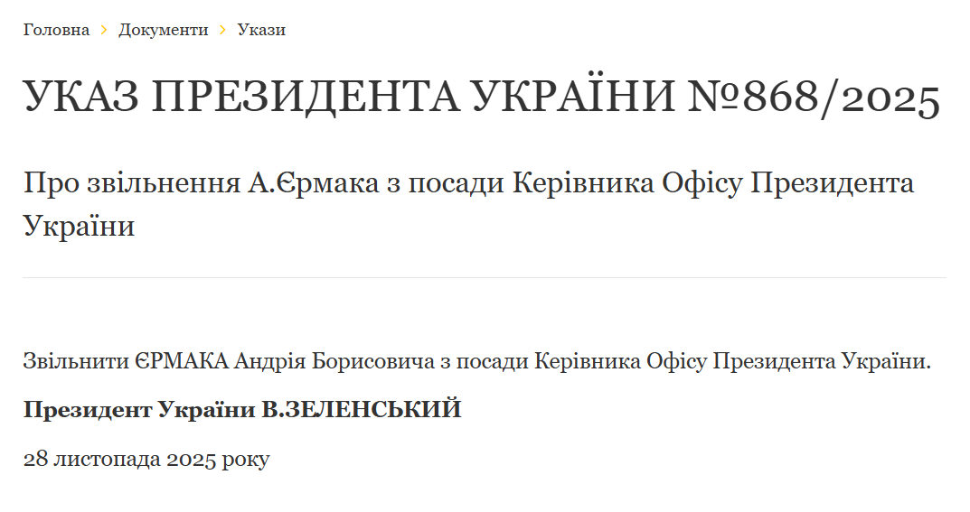 На офіційному інтернет-представництві Президента України опублікували указ, в якому йдеться про звільнення Андрія Єрмака із займаної посади.