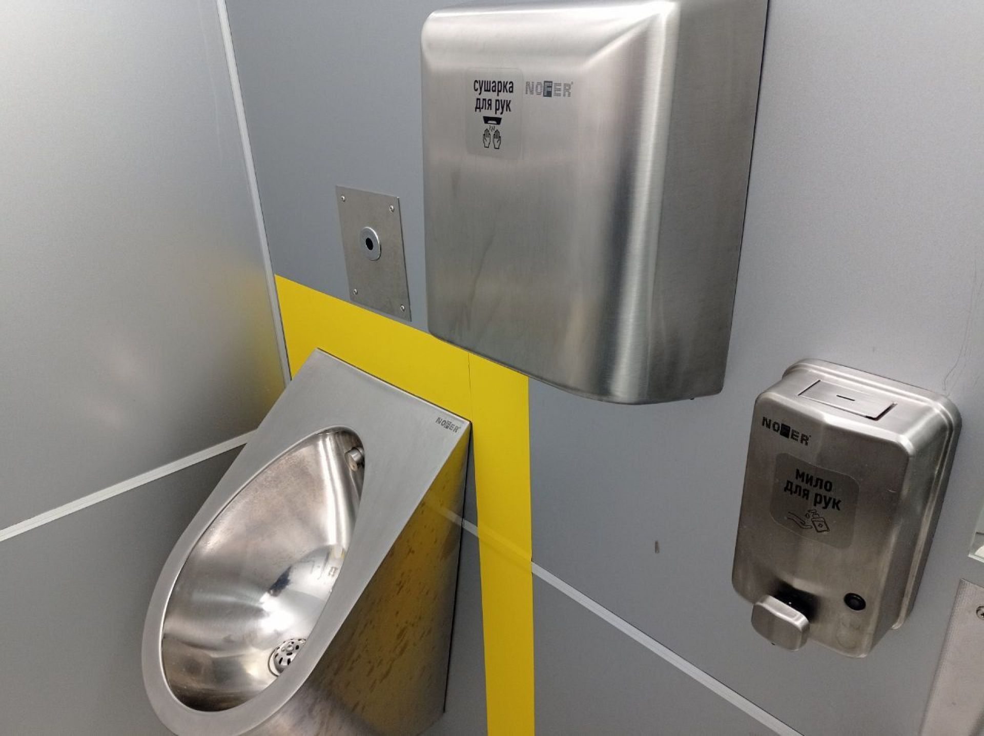 Рукомийники є біля виходу. Є мило та працює сушка для рук.