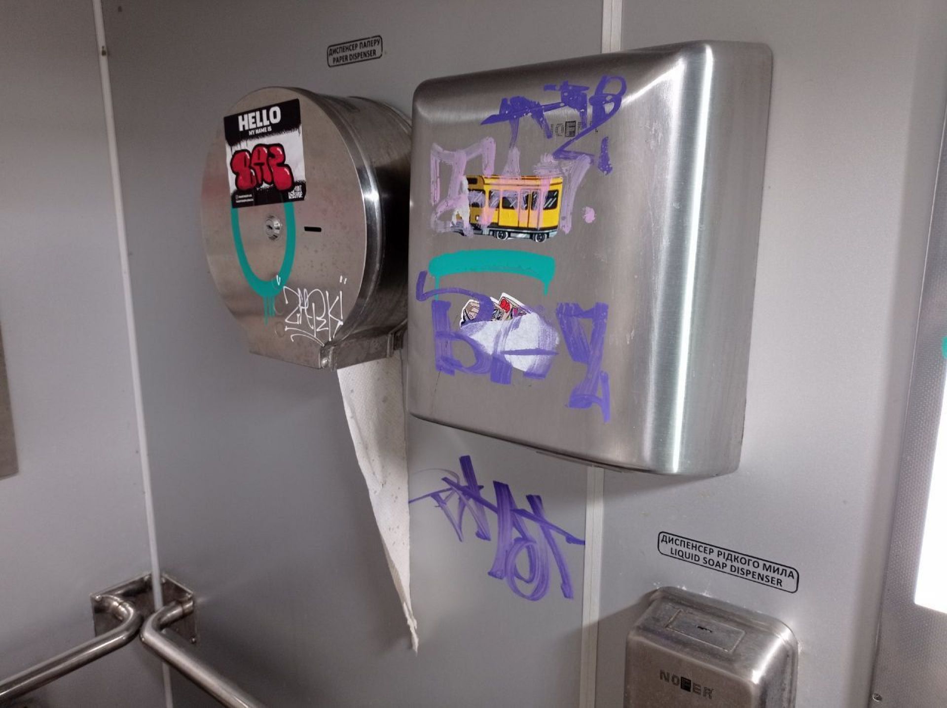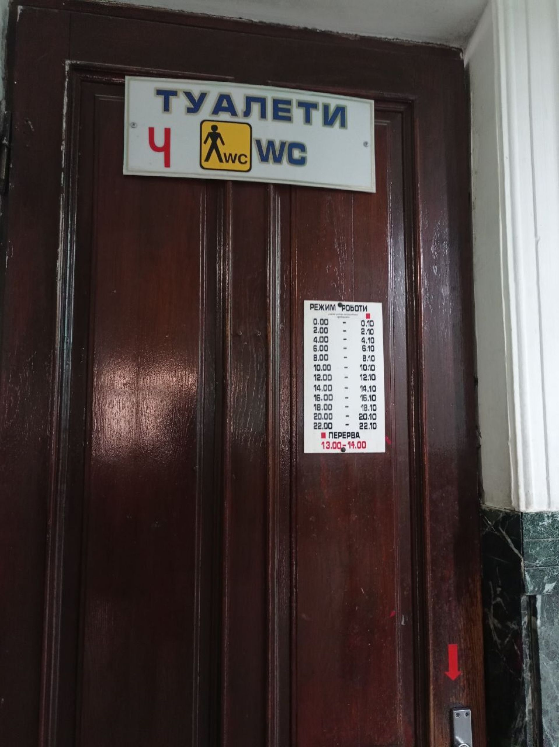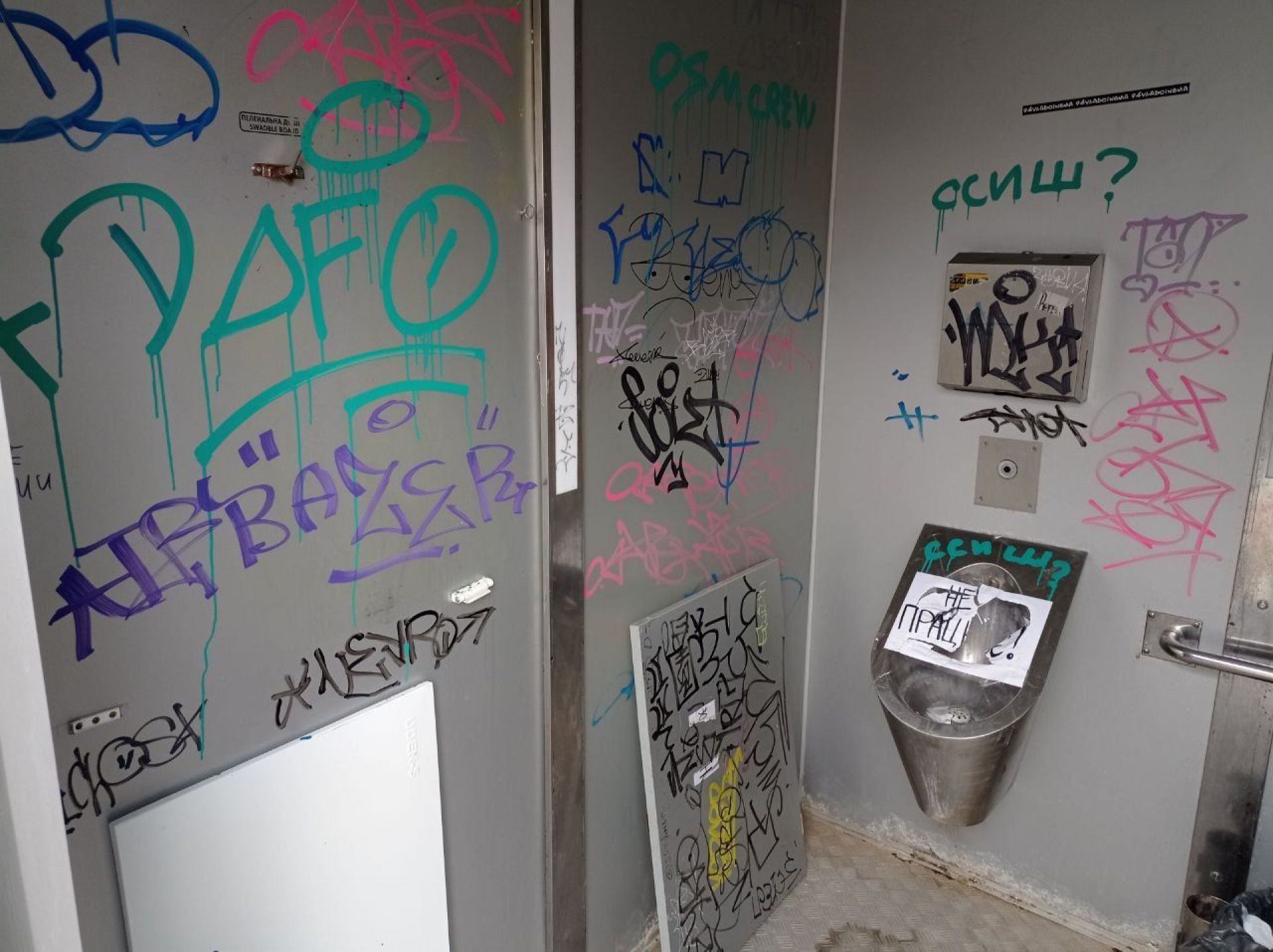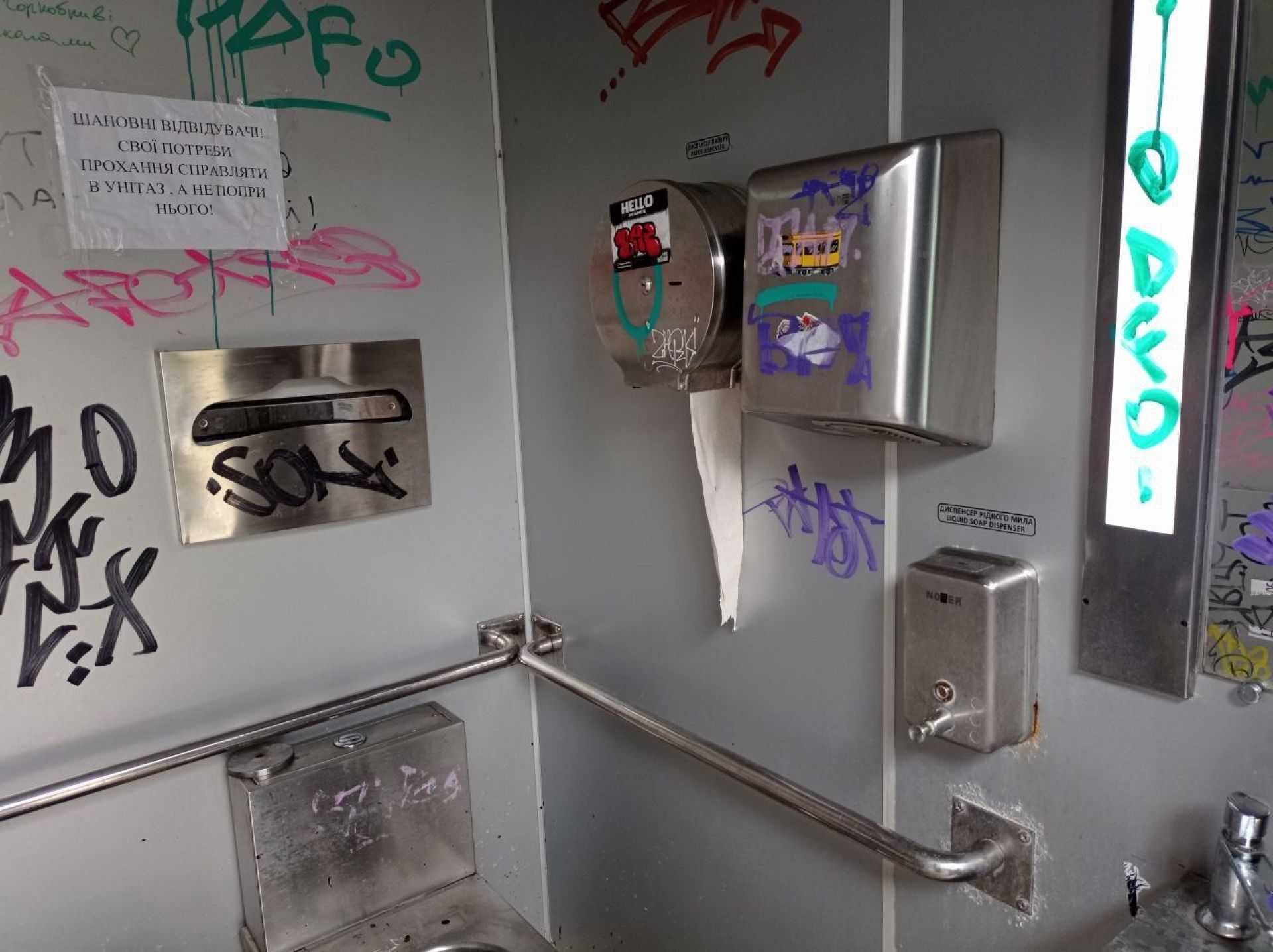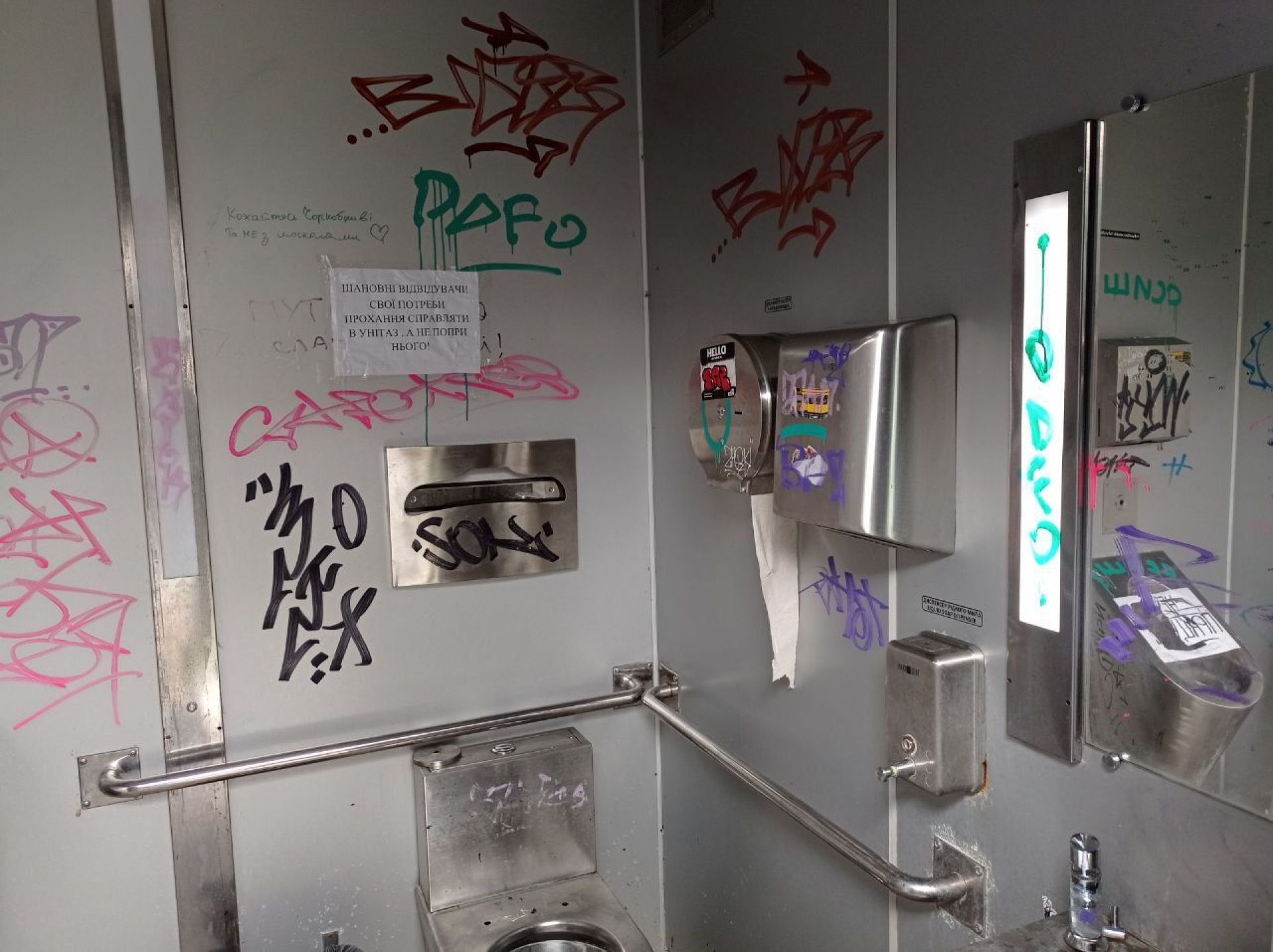 Всередині всі стіни розмальовані. Пеленальний столик зламаний. Пісуар не працює. Над туалетом наклеїли оголошення «Шановні відвідувачі! Свої потреби прохання справляти в унітаз, а не попри нього!».