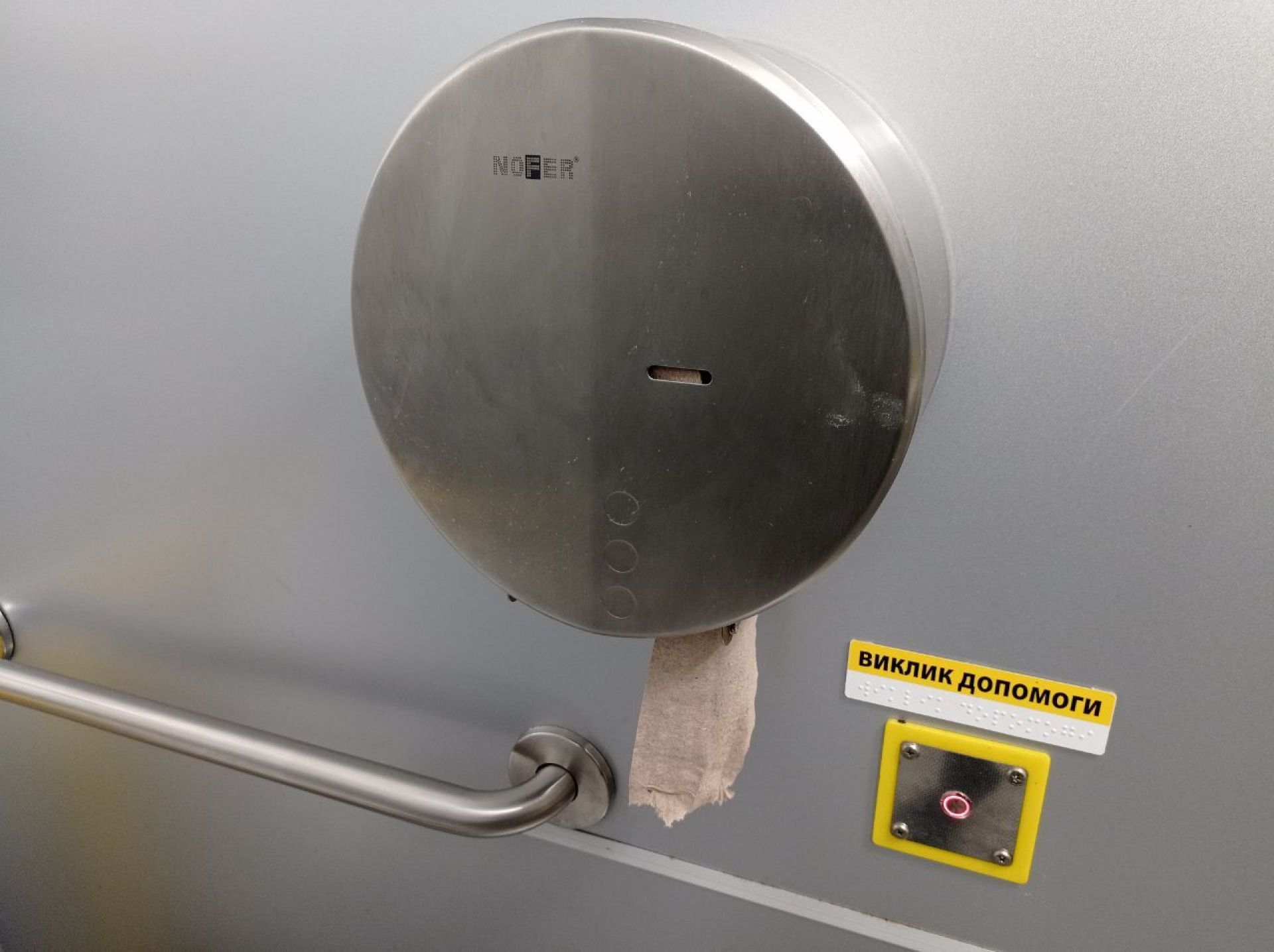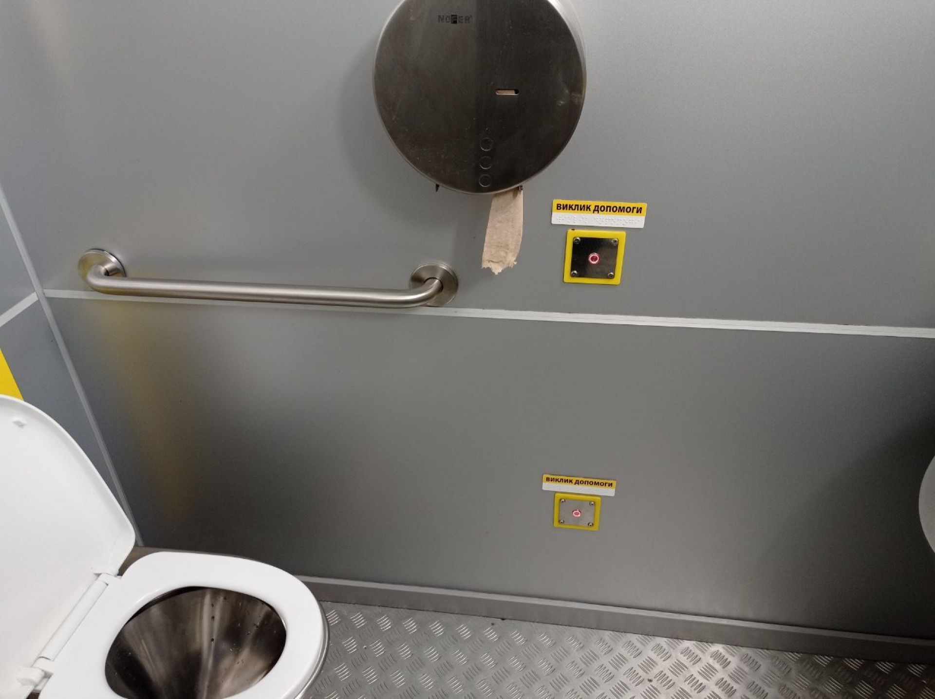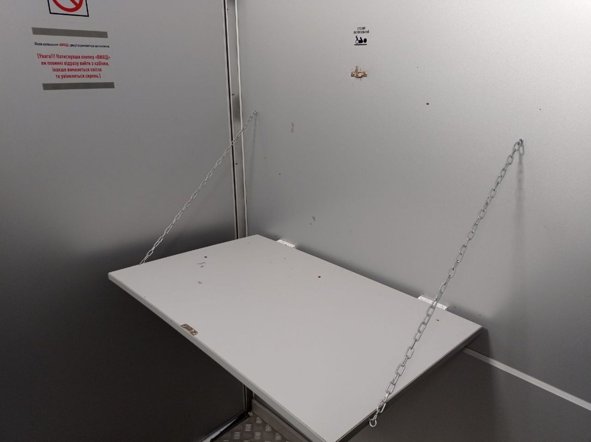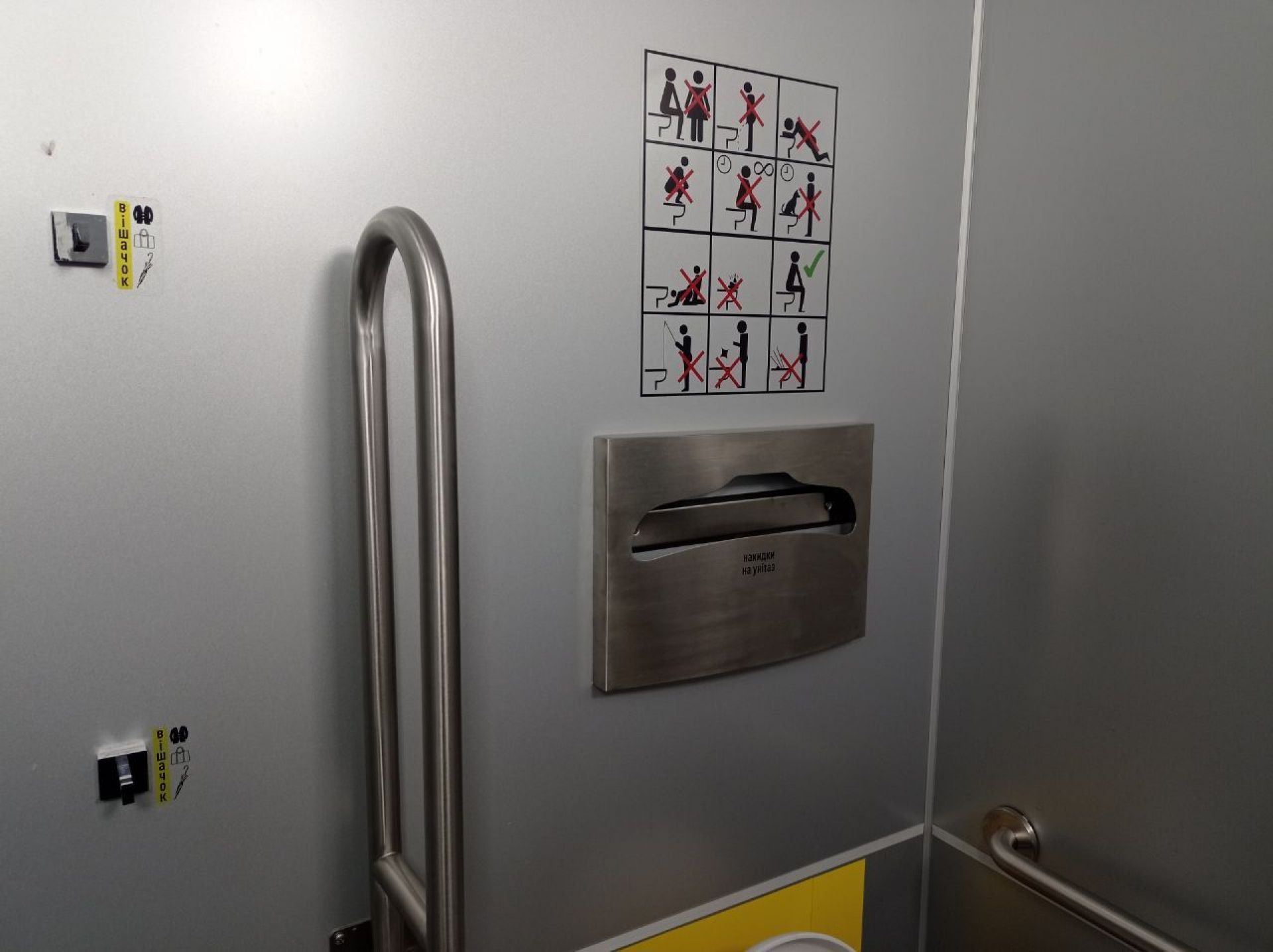 Всередині було чисто. Тут прибирають та працює витяжка, тож всередині комфортно. Є пеленальний столик. Працювала сушарка для рук, були паперові рушники, мило, туалетний папір. А от одноразових накладок на сидіння унітазу не було. Вода в рукомийнику була. Вона не розливається в усі сторони, як у попередній вбиральні.