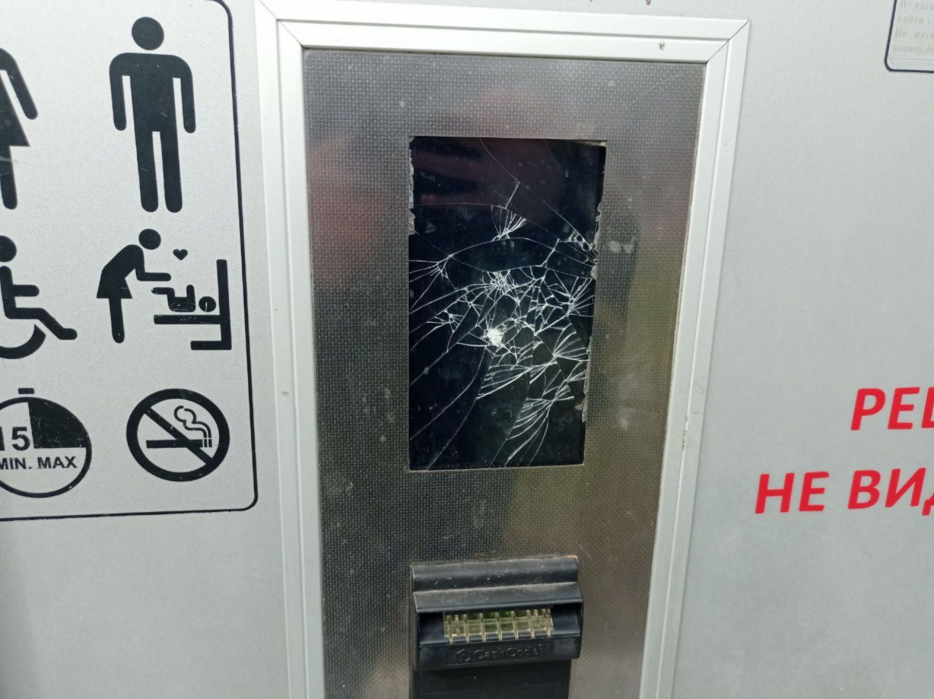 Що ж сталося з сучасною вбиральнею за 4 роки? Перше, що ми побачили – графіті та розбиті екрани біля купюро приймача. Що на них написано – роздивитися не можна. Одна кабінка не працювала.
