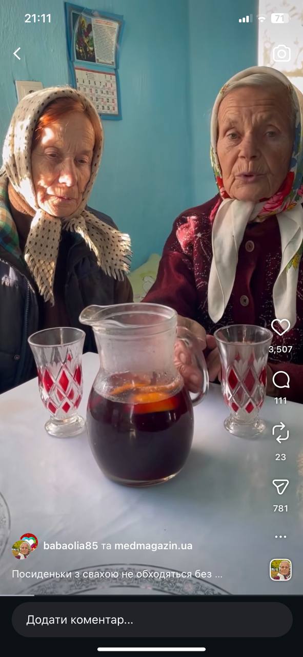 — Чудова бабусю Олю, мені дуже приємно дивитись твої відео. Обидві мої бабусі померли, і я дуже сумую за ними. Ти говориш точно так само, як вони тоді. Я виросла в Канаді, вивчаючи українську мову в них. Слухати тебе — це як знову слухати їх, — написала в Instagram користувачка Христина.