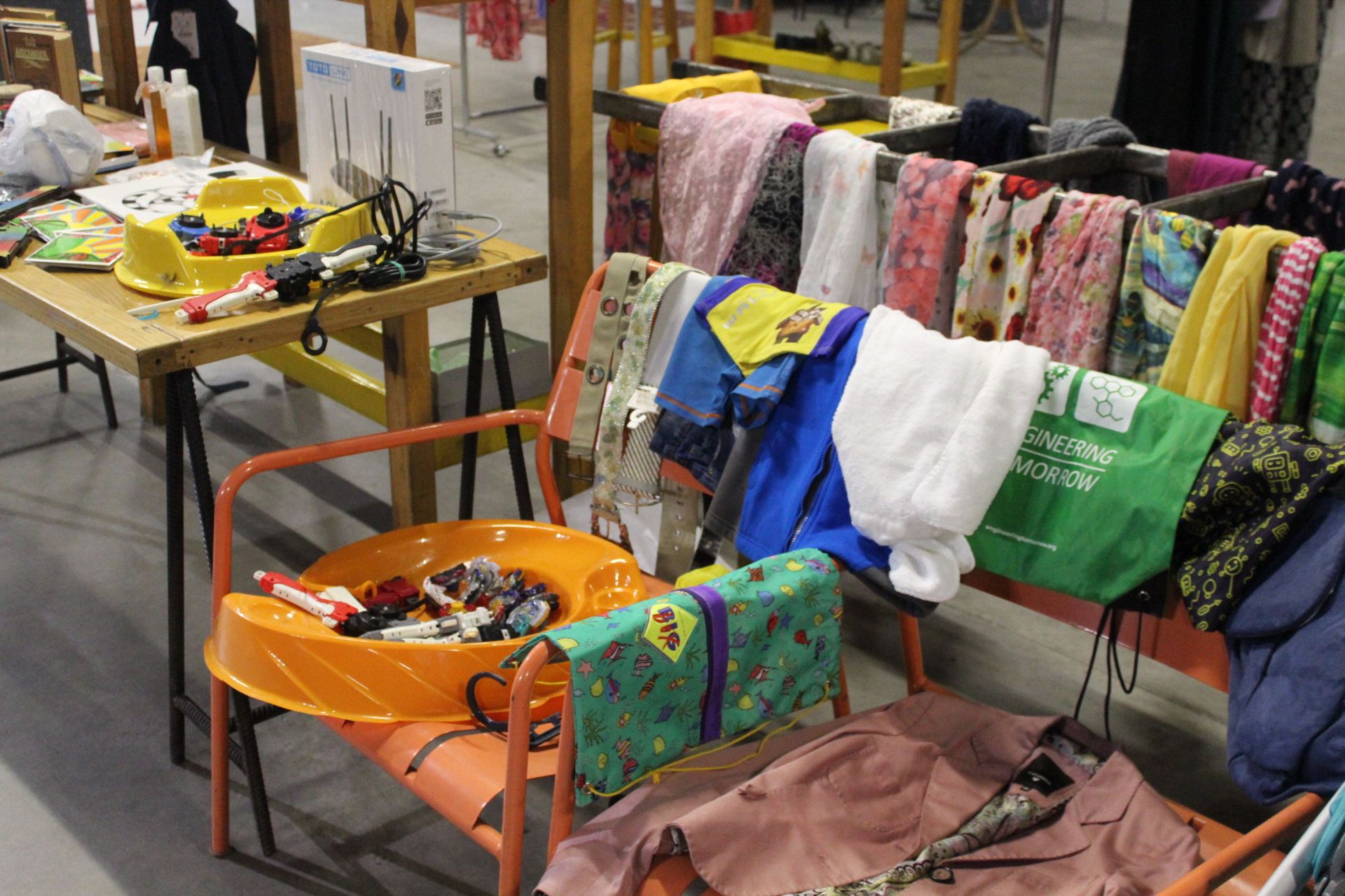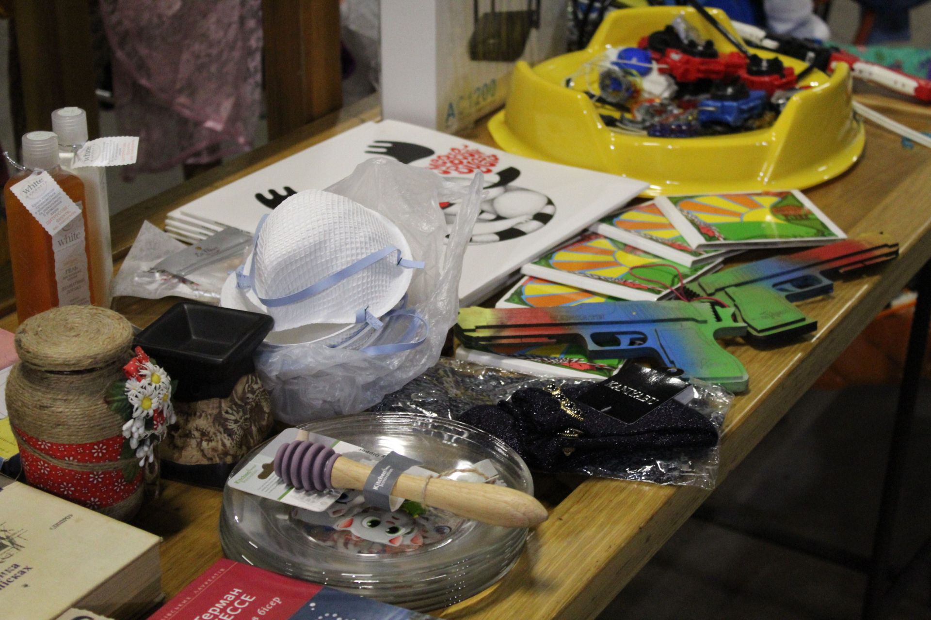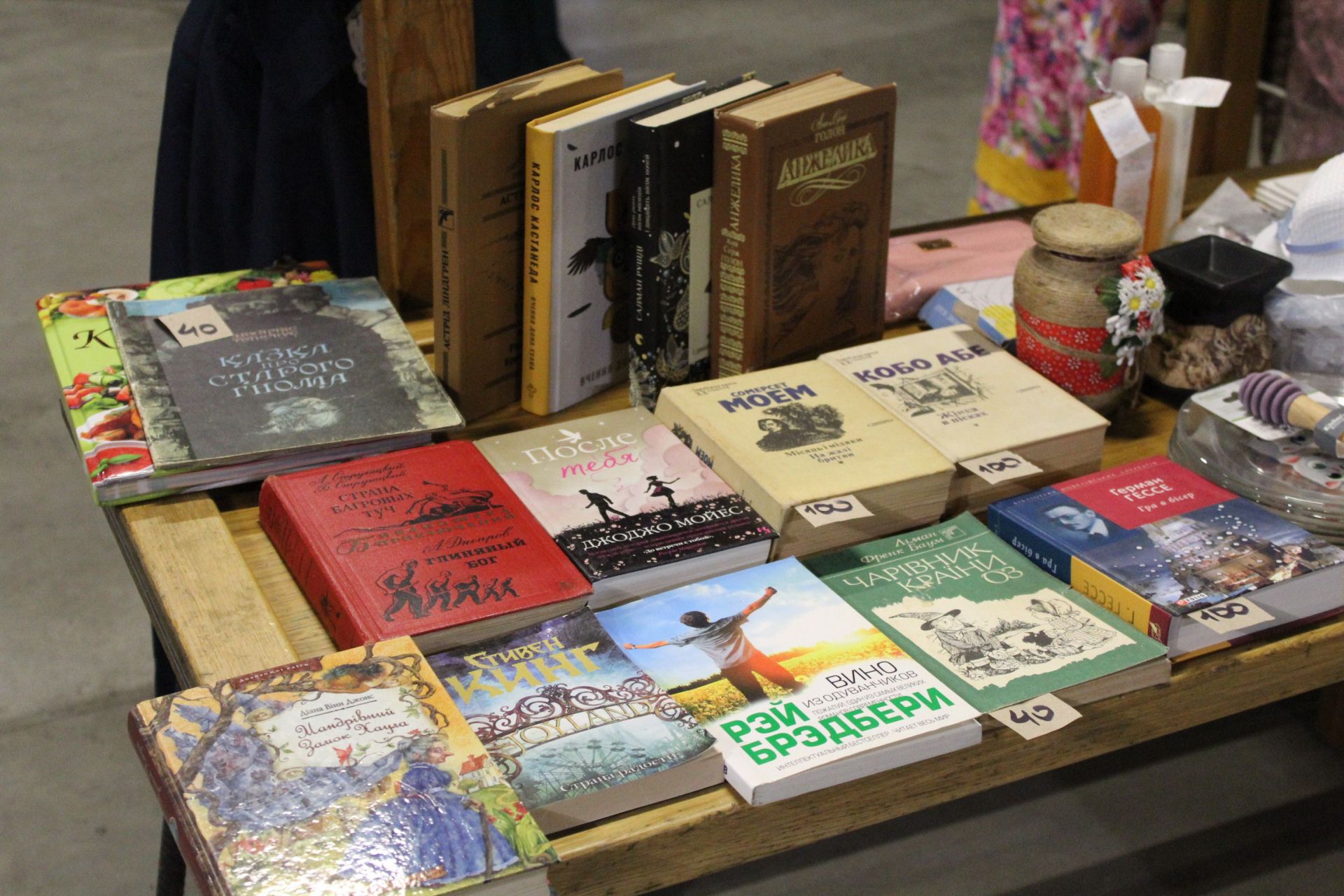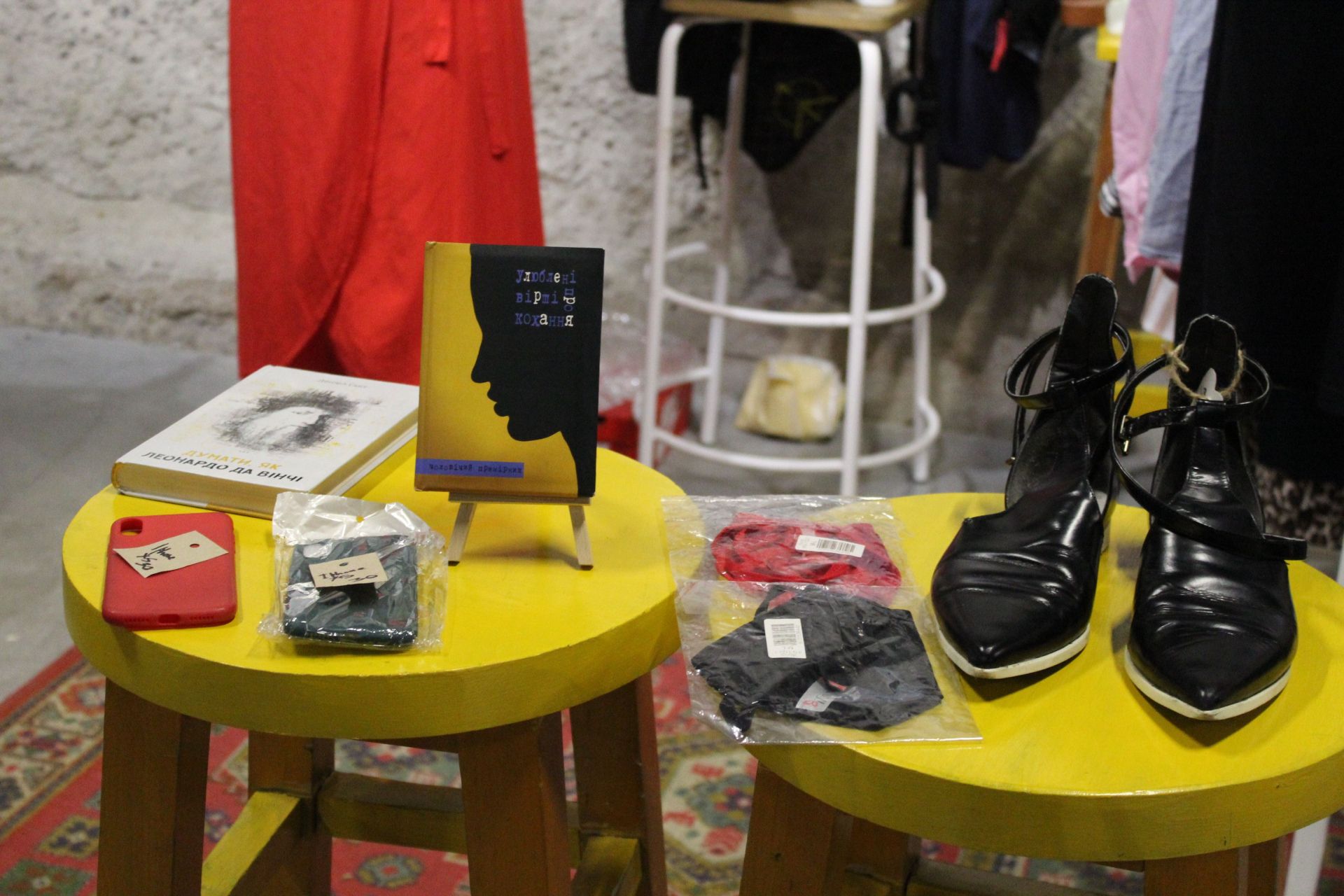 На благодійному розпродажі великий асортимент книг, ціни стартують від 40 гривень. Найдорожча – іноземна література за 100 гривень. Також знайти тут можна було чохли для смартфонів, тканинні маски з візерунками, альбоми, миючі засоби, свічки, прикраси з бісеру, зокрема сережки і кольє.
