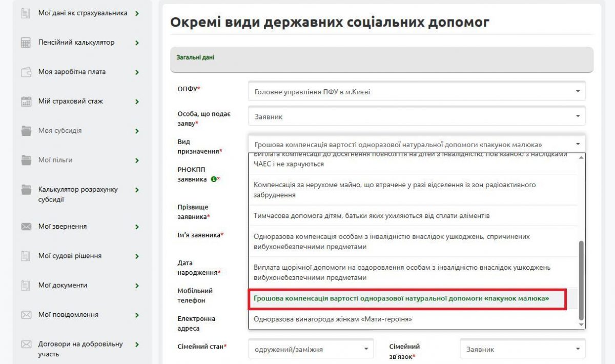 Крок 4. Заповніть онлайн-форму заяви, що з’явиться на екрані. Зазначте назву обраного Головного управління Пенсійного фонду України. У полі «Вид призначення» оберіть рядок «Грошова компенсація вартості одноразової натуральної допомоги «пакунок малюка».