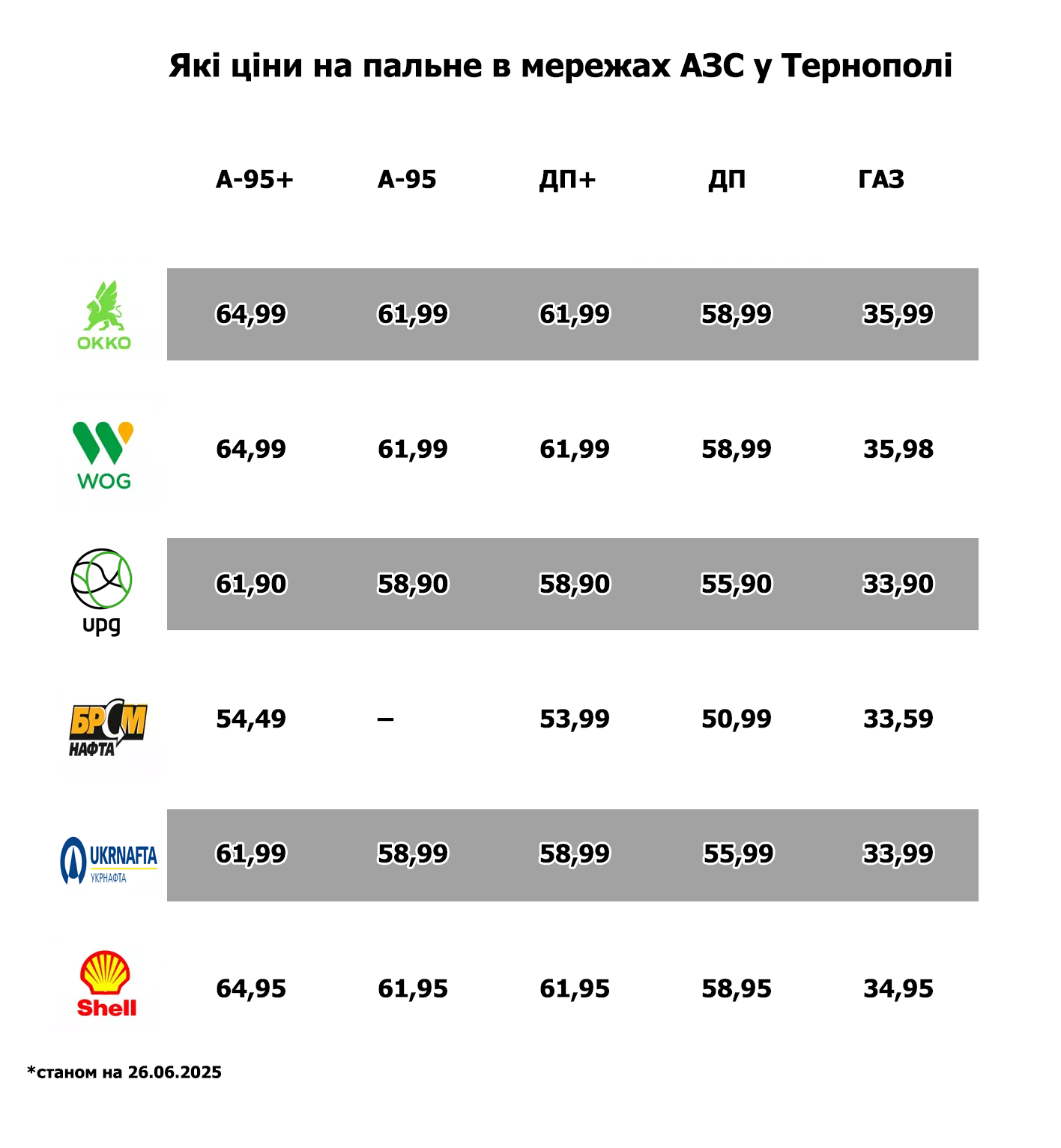 Станом на 26 червня у Тернополі актуальні такі ціни на пальне: